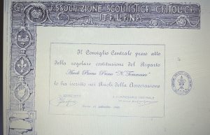Il gruppo Ascoli Piceno 1 nasce come gruppo Asci (Associazione scout cattolici italiani), quindi prima della nascita dell’Agesci, nel 1922; nasciamo con una prima unità, il reparto, che è stata iscritta ai ruoli dell’Asci in data 16 settembre 1922. Abbiamo 103 anni di attività. Successivamente il reparto è stato affiancato da una squadriglia libera appartenente all’Agi (Associazione guide italiane), quindi da una parte femminile. Ovviamente non sono stati 103 anni continuativi di attività perché il gruppo è stato sciolto come realtà associativa con l’avvento del fascismo, per poi riprendere le attività dopo la fine della guerra. Con AGESCI (Associazione guide e scout cattolici italiani) abbiamo festeggiato l’anno scorso i 50 anni.