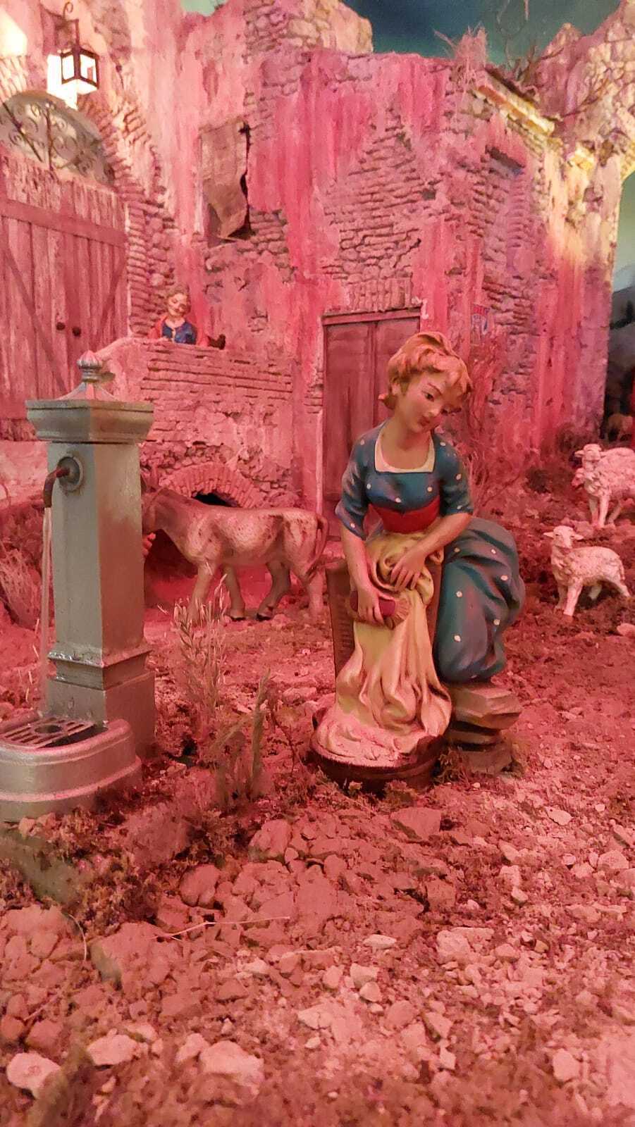 Il presepe nasce durante il lockdown, in un periodo di tempo sospeso che ha permesso di trasformare un sogno in realtà. «In quei mesi ho deciso di dare finalmente un’anima alla mia collezione Fontanini», spiega Lino. Con l’aiuto di due amici, il progetto prende forma: un presepe “ad angolo”, studiato per adattarsi alle statue esistenti e valorizzarne ogni dettaglio. Al centro, la Natività. Intorno, due mondi che dialogano: una postazione popolare e una araba, unite simbolicamente da un ponte. «È un ponte architettonicamente doppio, uno arabo e uno mediterraneo: un segno di unione tra culture», sottolinea Domizi. Un messaggio potente, reso ancora più toccante dalla semplicità delle scene di vita quotidiana.