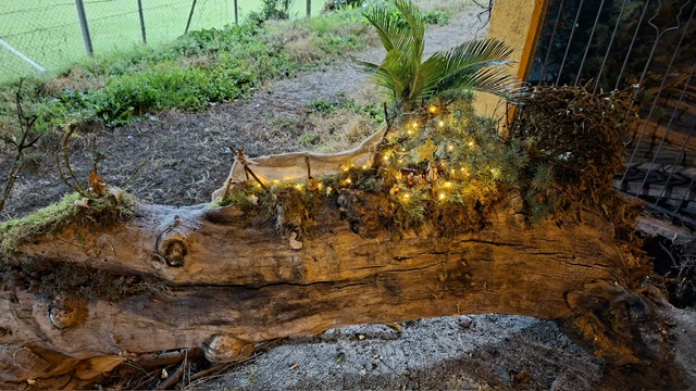 Quel tronco, che poteva essere solo un segno di abbandono, è diventato una culla. Qualcuno ha saputo guardarlo con occhi diversi: non come un resto inutile, ma come un’occasione. Ed è così che, attorno a quel legno caduto, ha preso forma un presepe improvvisato. Una capanna semplice, le figure essenziali, le pecore, i pastori, e una luce che rompe il buio. Nulla di sfarzoso, ma tutto profondamente vero.