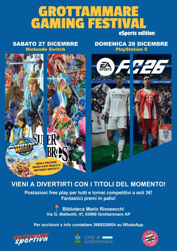 Il “Grottammare Gaming Festival” è una proposta di intrattenimento per giovani e appassionati dedicata al mondo del gioco digitale e alle nuove forme di socialità. L’iniziativa è organizzata dalle associazioni “Grottammare Sportiva” e “Sporting Grottammare”, con il supporto del Comune di Grottammare.