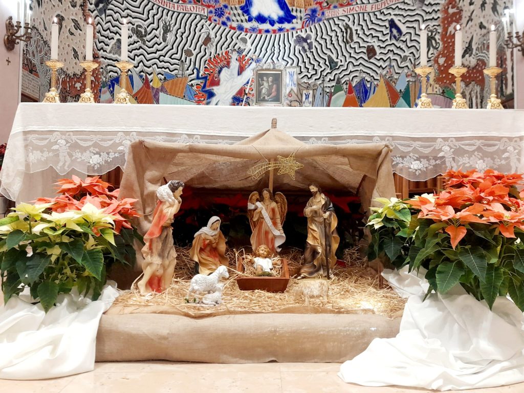 Sull’altare, splendente e fulgido come al solito, campeggiava il tradizionale presepe artistico con la natività avvolta da un fascio di stelle di Natale dai colori caldi e vivaci, come a dare ancora più risalto alla festività del giorno, la Santa Famiglia di Gesù, Maria e Giuseppe.