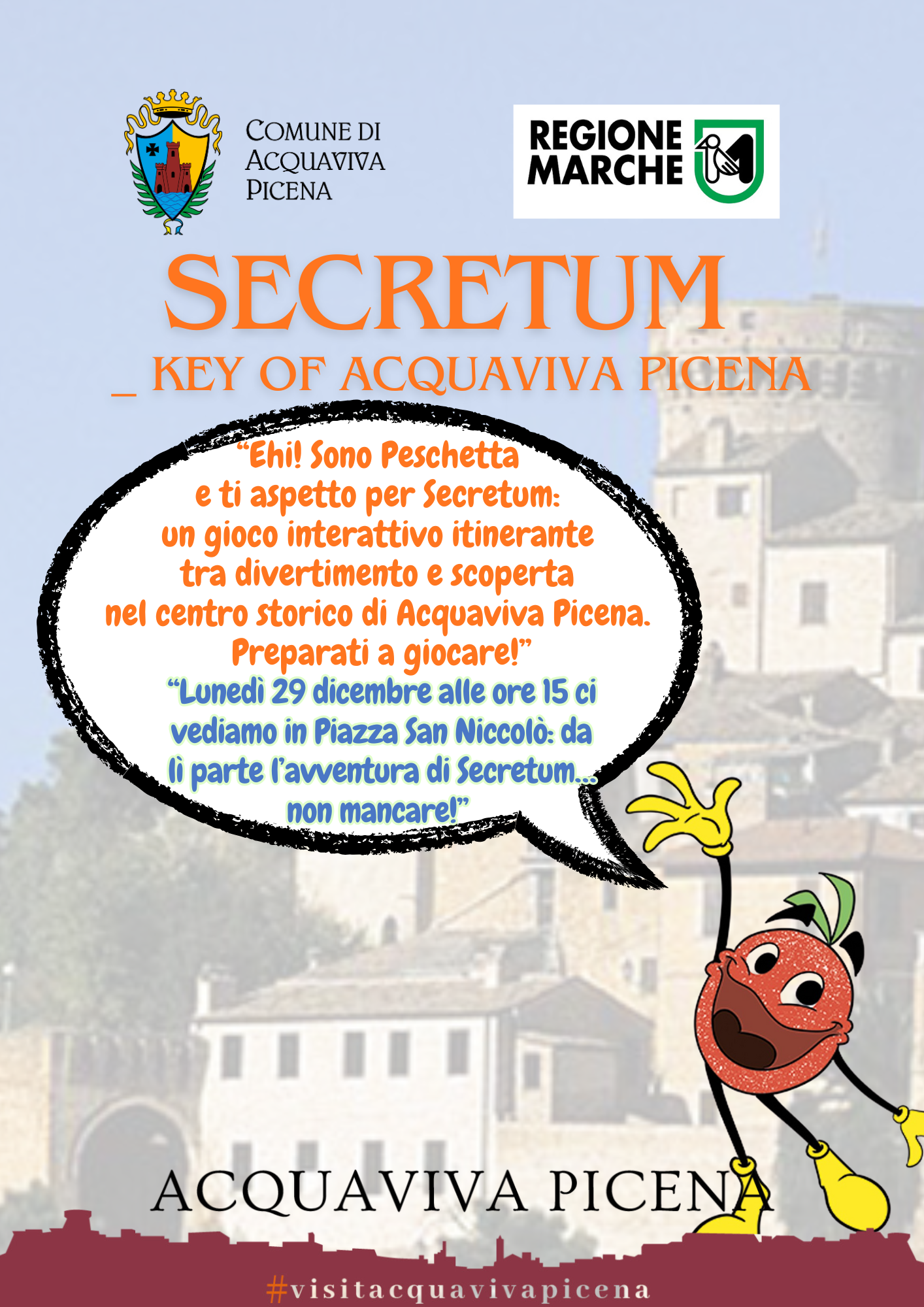 ACQUAVIVA PICENA – Lunedì 29 dicembre, con appuntamento alle ore 15 in Piazza San Niccolò, prende ufficialmente il via “Secretum – The Key of Acquaviva Picena”, un innovativo gioco interattivo itinerante pensato per valorizzare il centro storico del borgo. A guidare i partecipanti in questa esperienza sarà Peschetta, personaggio simbolo che accompagnerà grandi e piccoli alla scoperta della storia e delle bellezze di Acquaviva Picena.