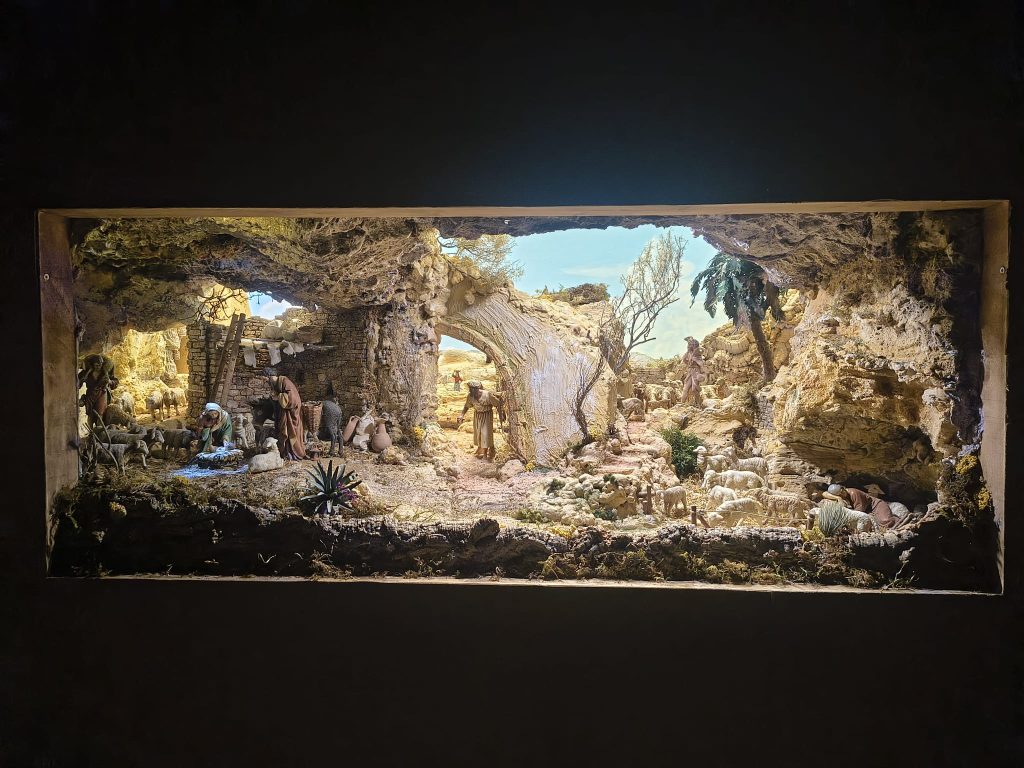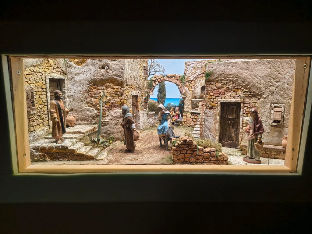 L’opera, che è possibile visitare fino al 18 Gennaio 2026, è stata curata da un gruppo di amanti del presepismo che, per il 41° anno consecutivo, ha allestito il presepe con cura e creatività. Due le scene principali rappresentate: la ricerca dell’alloggio da parte di Maria e Giuseppe e la natività.