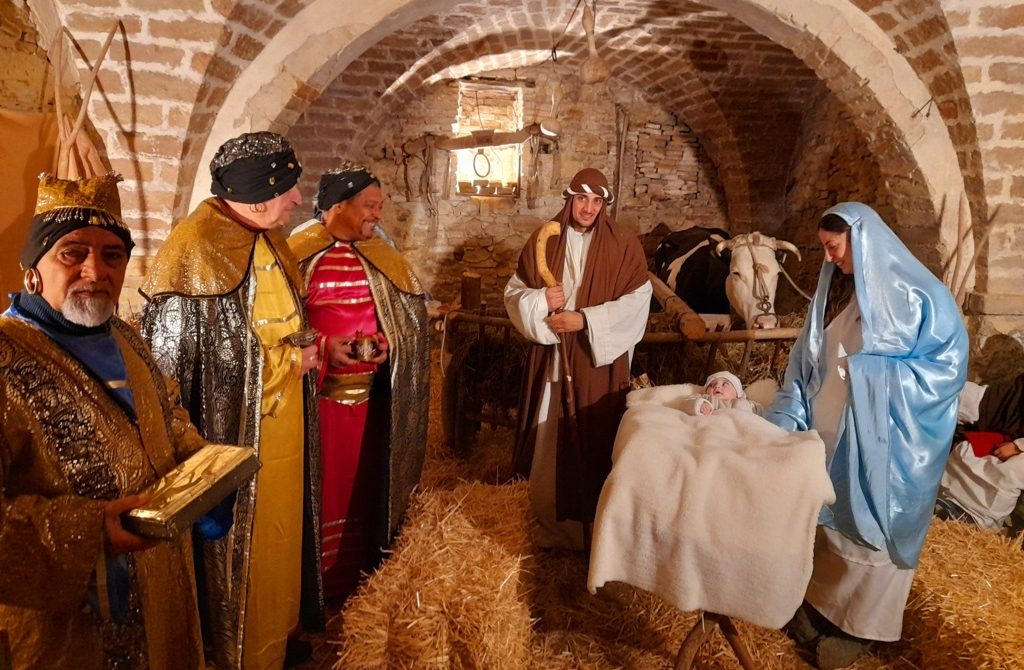Ma non solo. La nostra è anche una rievocazione storica dettagliata con tante scene tratte dai racconti evangelici, altre riguardanti la vita quotidiana e gli antichi antichi mestieri, altre ancora create dalla fantasia degli organizzatori, ma sempre con un’accuratezza storica fuori dal comune. Al culmine del cammino che i visitatori faranno tra le rue del nostro borgo, ci sarà la natività, cuore del nostro presepe vivente e cuore del mistero del Natale. I figuranti , con costumi d’epoca, impersoneranno Maria, Giuseppe e il Bambino Gesù, circondati dai pastori e dai Re Magi.