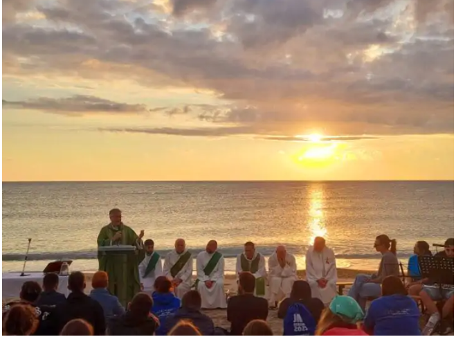 Don Matteo è un sacerdote che intreccia il suo ministero con le attese delle nuove generazioni e l’appuntamento all’alba è nato anche dal desiderio di ritrovare i ragazzi incontrati alla GMG.  “Dopo Lisbona 2023 – aggiunge – la partecipazione era stata davvero significativa. Anche quest’anno hanno risposto 350 giovani della diocesi, insieme ad alcuni adulti e anziani. L’invito è stato diffuso soprattutto tramite i social, a partire da quelli della pastorale giovanile. Un centinaio dei presenti aveva partecipato anche al Giubileo dei giovani con Papa Leone. Dal Campo Ciarrocchi in Porto D’Ascoli abbiamo percorso 800 metri a piedi per raggiungere il luogo deputato alla celebrazione eucaristica. Poi abbiamo celebrato le Lodi al buio, cantando il Benedictus proprio all’alba”. A presiedere l’eucaristia il vescovo, mons. Gianpiero Palmieri, insieme a diversi sacerdoti diocesani, segno di una comunità che accompagna e sostiene il cammino dei più giovani.