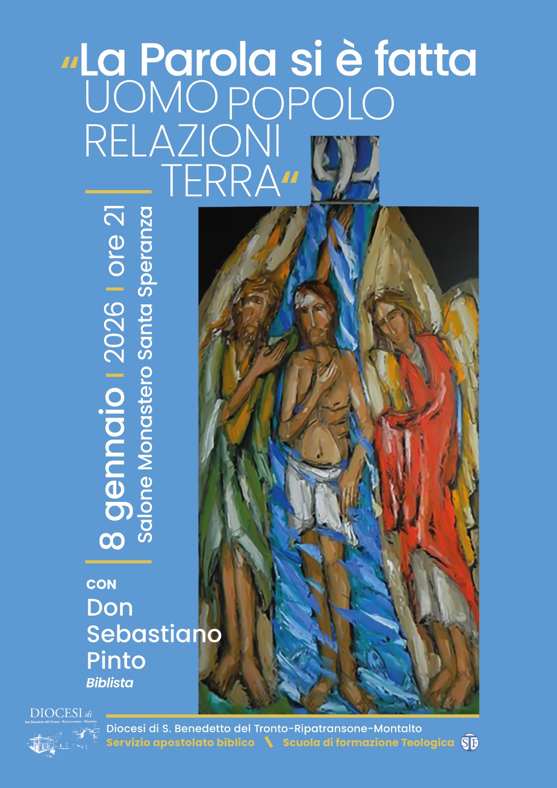 DIOCESI – Negli ultimi giorni del tempo di Natale la comunità si prepara a celebrare la festa del Battesimo di Gesù con un incontro di approfondimento sul tema dell’Incarnazione, promosso dal Servizio per l’Apostolato Biblico e dalla Scuola di Formazione Teologica. L’appuntamento, dal titolo «La Parola si è fatta uomo, popolo, relazioni, terra», si terrà martedì 8 gennaio alle ore 21.00 nel salone del monastero di Santa Speranza.