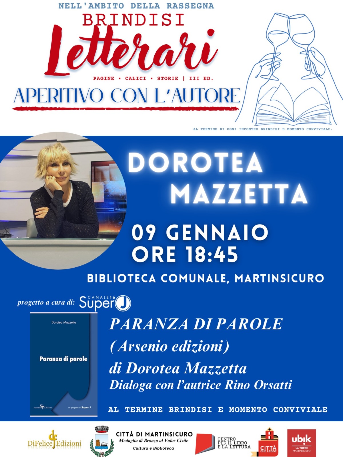 MARTINSICURO – Venerdì 9 gennaio alle ore 18.45 si terrà a Martinsicuro il quarto e ultimo appuntamento della rassegna Brindisi Letterari, ospitato presso la Biblioteca Comunale di via Aldo Moro. Protagonista dell’incontro sarà Dorotea Mazzetta, volto storico del giornalismo teramano, che presenterà il suo nuovo libro Paranza di parole (Arsenio Edizioni), nato da un progetto di Super J.