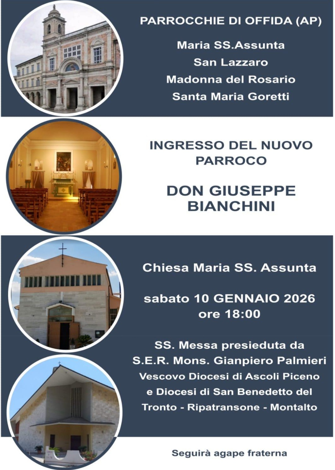 L’ingresso di don Giuseppe Bianchini segna un passaggio importante per la vita pastorale delle comunità offidane, che si apprestano ad accoglierlo con spirito di comunione, gratitudine e fiducia, nel vivo ricordo del ministero di don Armeno Antonini.