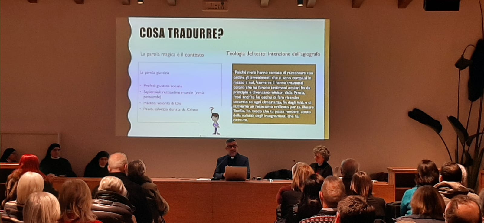 Nel suo intervento, il biblista ha innanzitutto espresso gratitudine ai partecipanti e agli organizzatori, sottolineando come nulla, nella vita di fede, sia scontato e come dietro ogni iniziativa vi sia il servizio silenzioso e generoso di persone che investono tempo ed energie per condividere la Parola. Da qui ha preso avvio una riflessione profonda sul significato dell’Incarnazione come processo di “traduzione” della Parola di Dio nella vita concreta degli uomini.