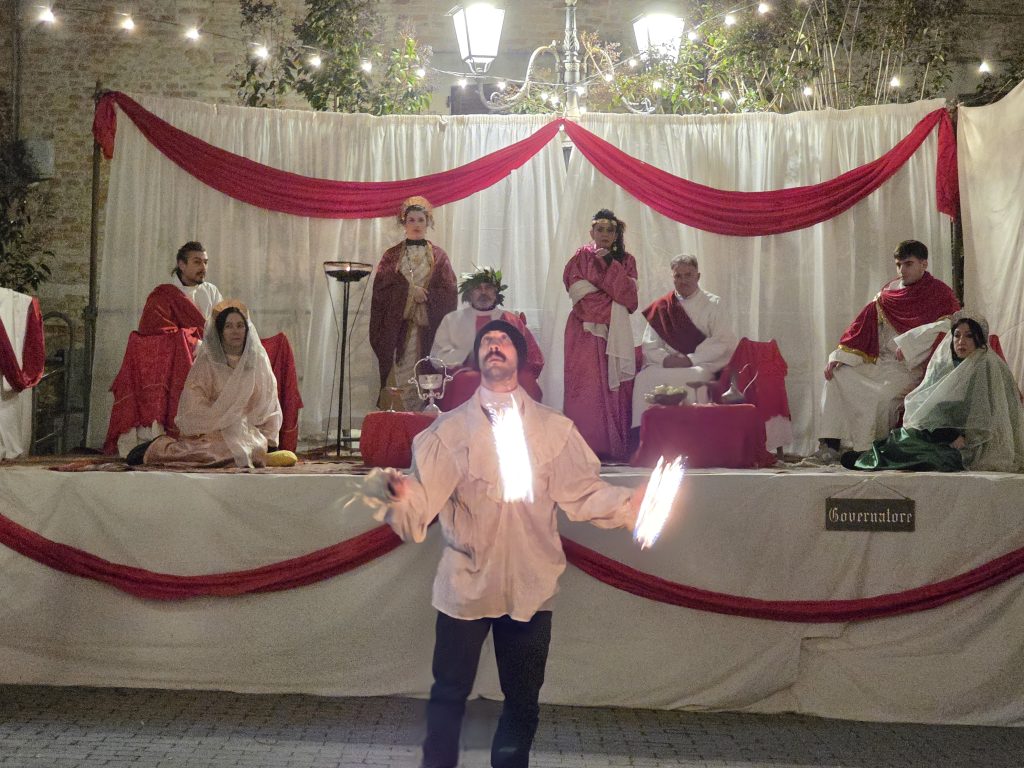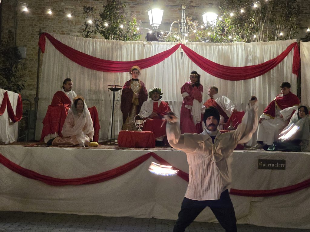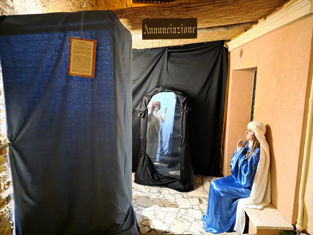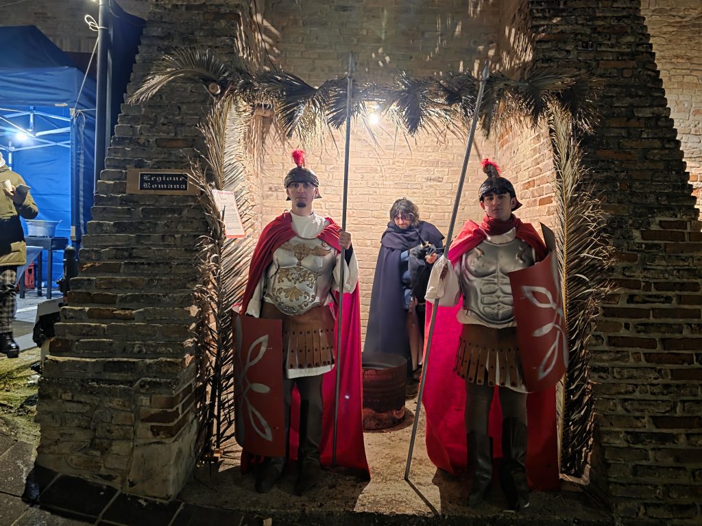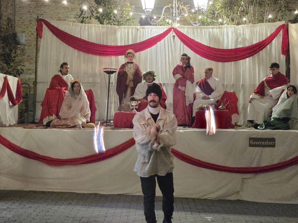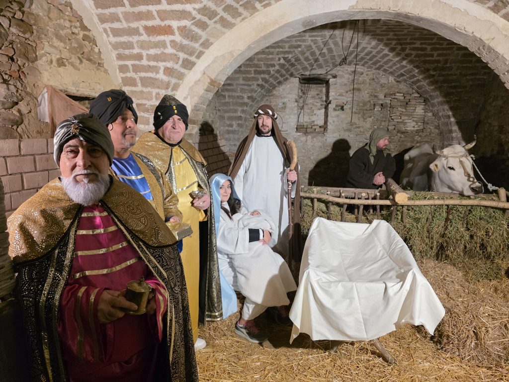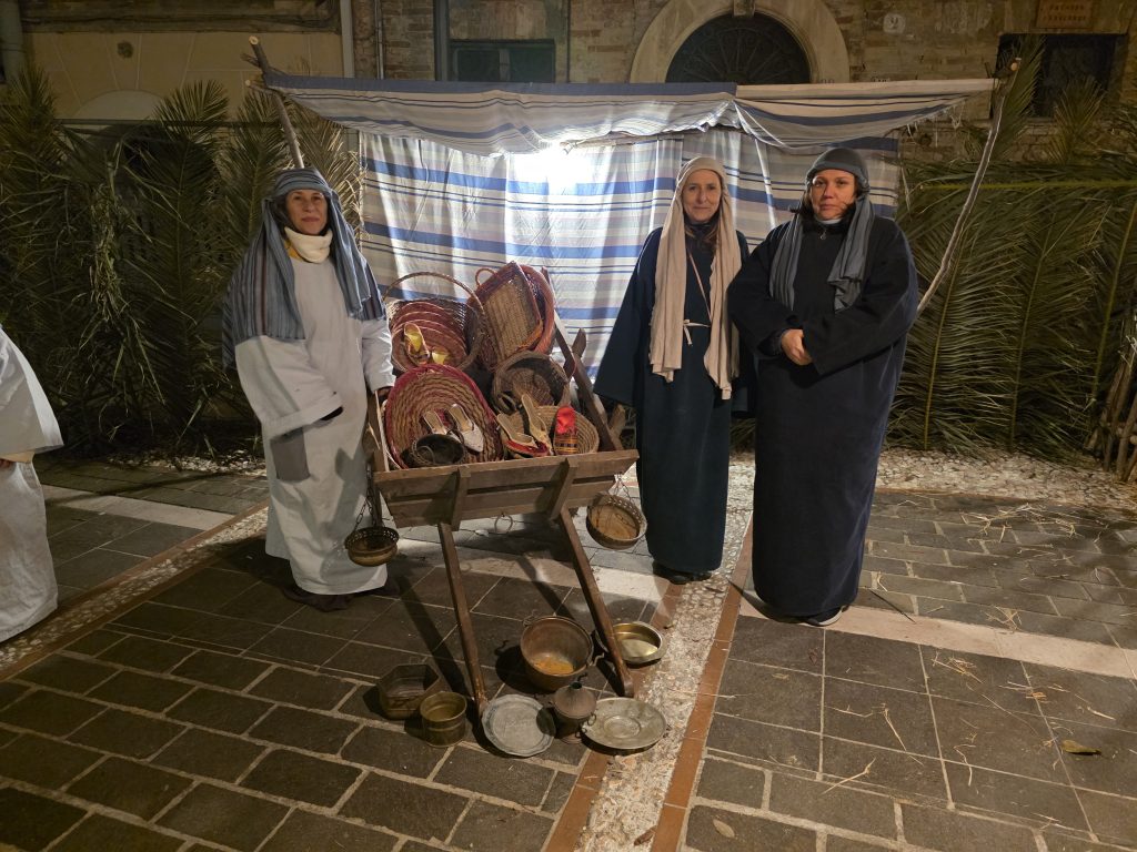 Lungo il percorso i visitatori hanno incontrato mangiafuoco, musicanti con cornamuse, danzatrici del ventre, soldati romani a cavallo, cambiavalute, aruspici, giocatori di dadi, astrologi, scribi, ma anche massaie, pescatori, pastori ed artigiani che svolgevano antichi mestieri, come il fabbro, il bottaio, il vasaio, la casara, il ramaio, il bottaio, l’arrotino e tanti altri. Numerose e bellissime le scene tratte dai racconti evangelici, come l’Annunciazione dell’Angelo a Maria, la Visitazione di Maria ad Elisabetta, il Censimento e la Corte di Erode, anche se la scena che maggiormente ha attirato l’attenzione e lo stupore dei visitatori è stata, come di consueto, quella della Natività con l’arrivo dei Magi e soprattutto la vista del Bambinello. Quest’anno la Sacra Famiglia è stata rappresentata da Erica e Nicolò Raschiatore, con il loro piccolo Gregorio. Presenti lungo il percorso anche tre punti di ristoro.
