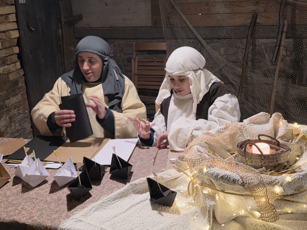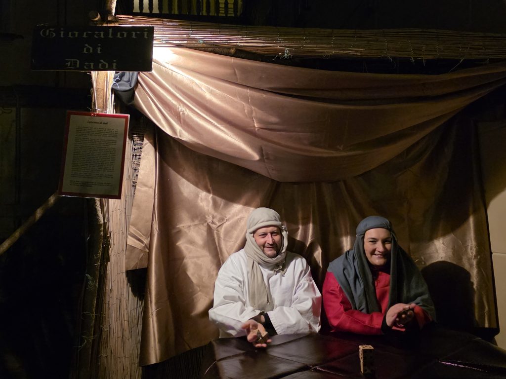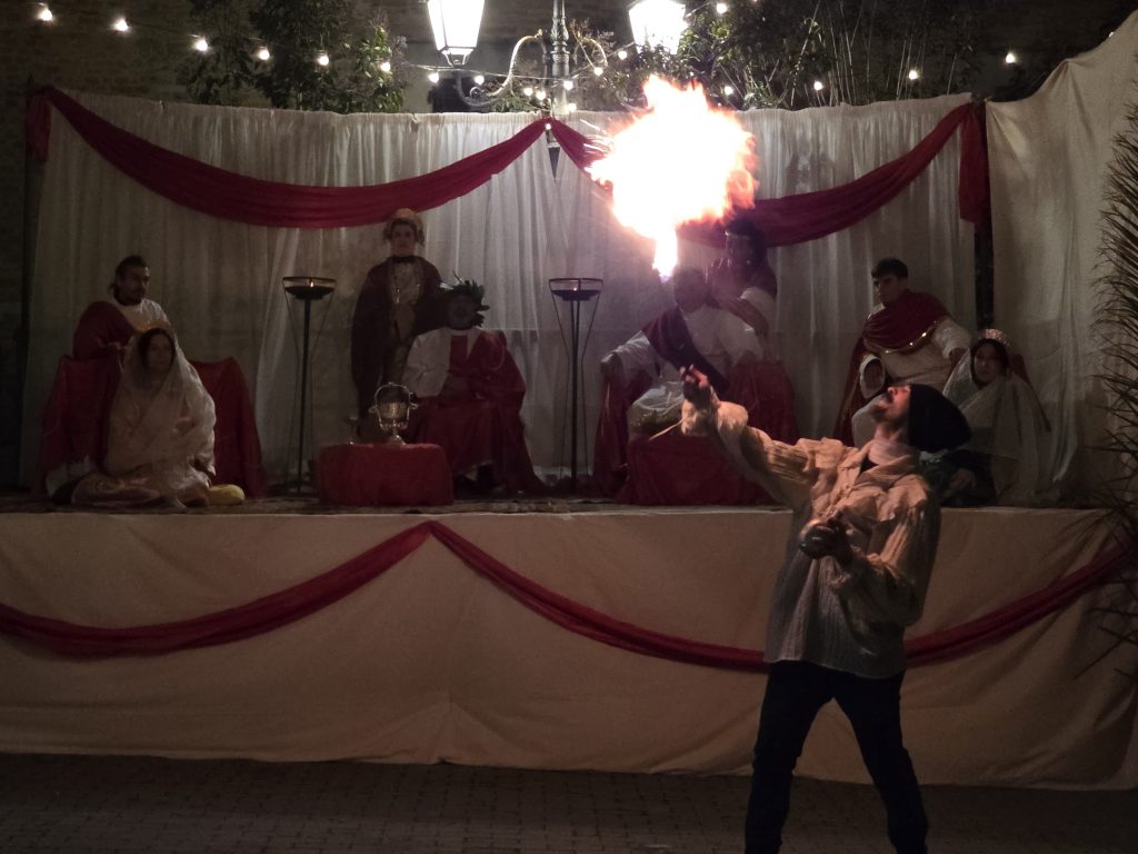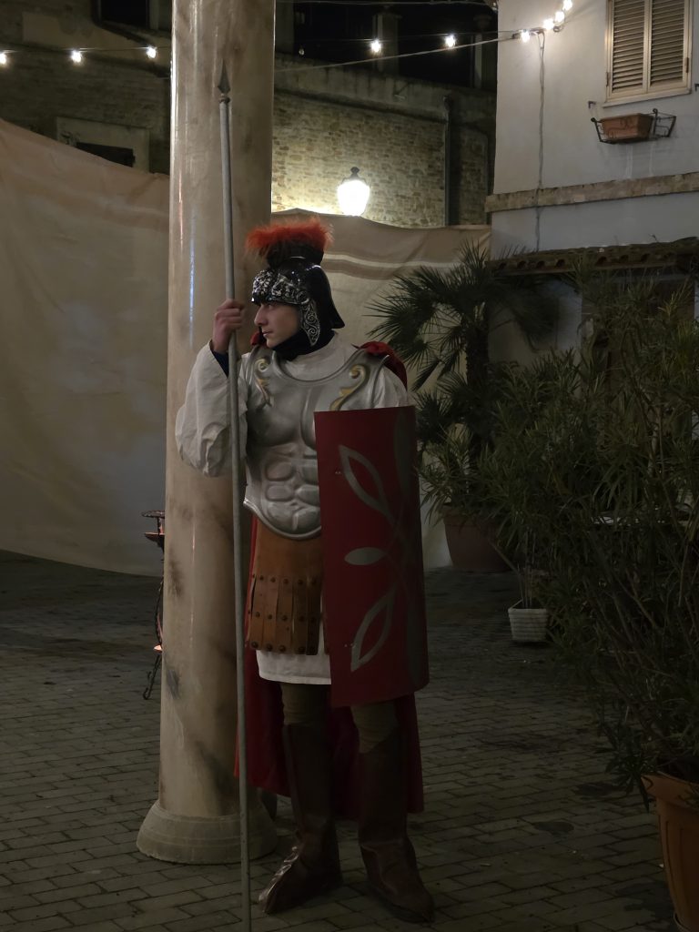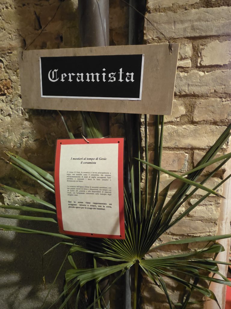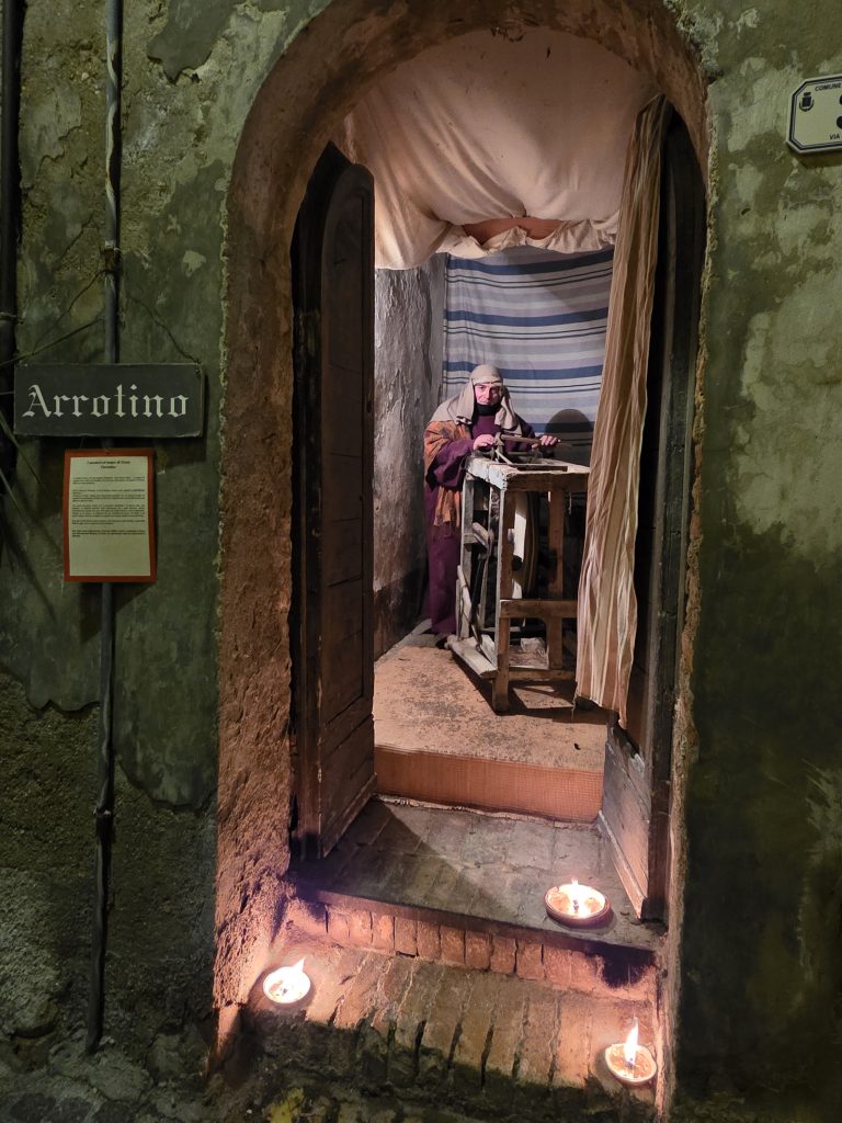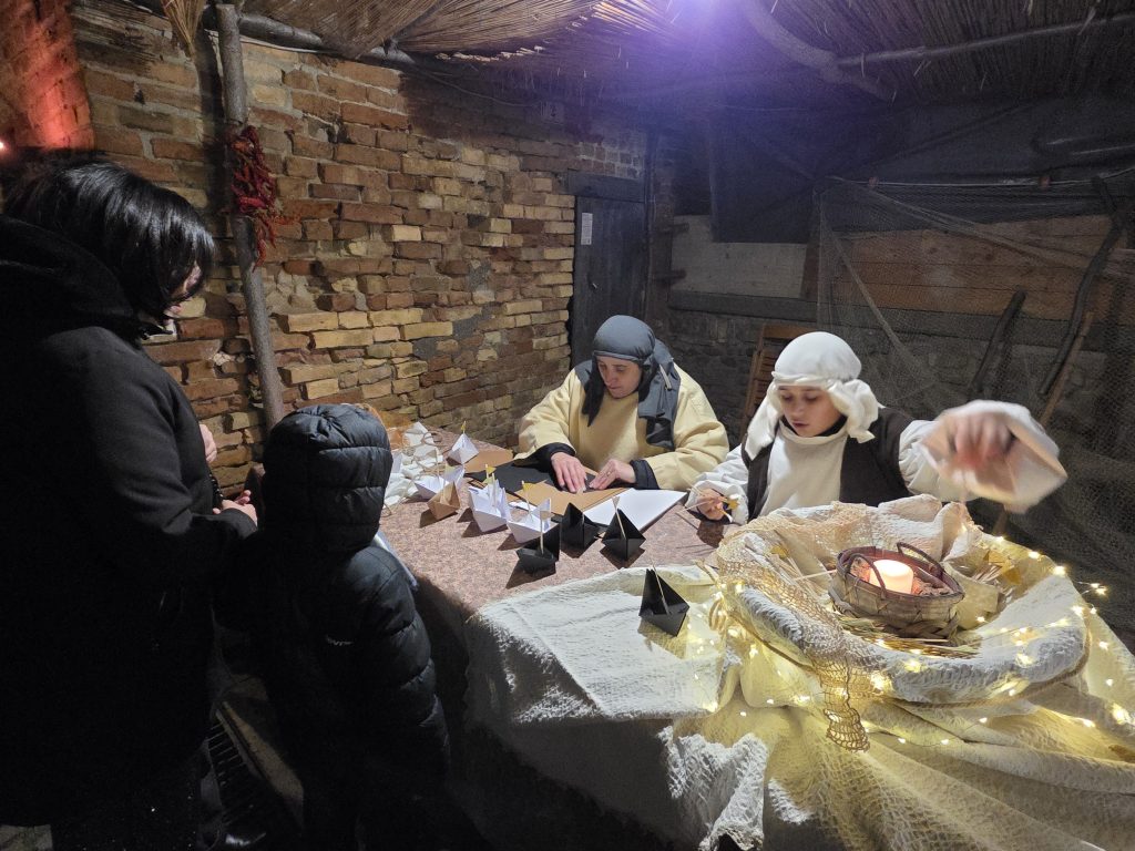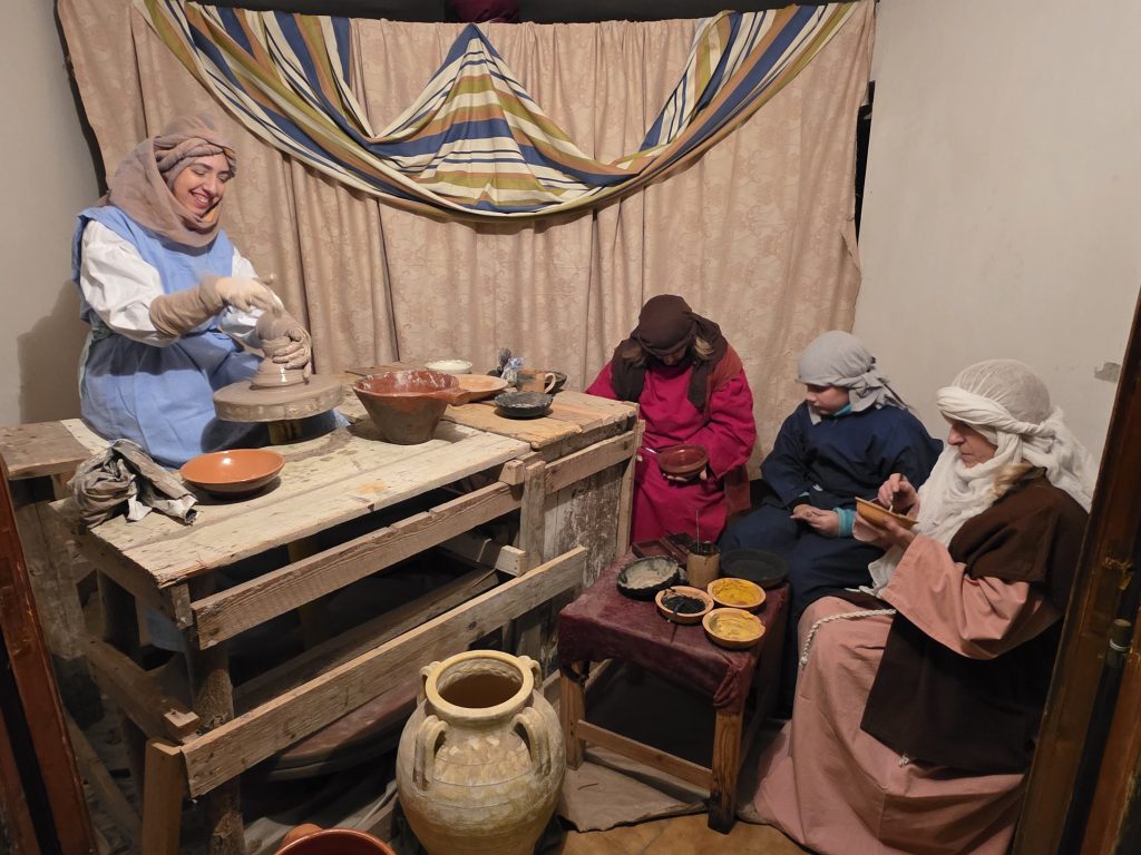Lungo il percorso i visitatori hanno incontrato mangiafuoco, musicanti con cornamuse, danzatrici del ventre, soldati romani a cavallo, cambiavalute, aruspici, giocatori di dadi, astrologi, scribi, ma anche massaie, pescatori, pastori ed artigiani che svolgevano antichi mestieri, come il fabbro, il bottaio, il vasaio, la casara, il ramaio, il bottaio, l’arrotino e tanti altri. Numerose e bellissime le scene tratte dai racconti evangelici, come l’Annunciazione dell’Angelo a Maria, la Visitazione di Maria ad Elisabetta, il Censimento e la Corte di Erode, anche se la scena che maggiormente ha attirato l’attenzione e lo stupore dei visitatori è stata, come di consueto, quella della Natività con l’arrivo dei Magi e soprattutto la vista del Bambinello. Quest’anno la Sacra Famiglia è stata rappresentata da Erica e Nicolò Raschiatore, con il loro piccolo Gregorio. Presenti lungo il percorso anche tre punti di ristoro.