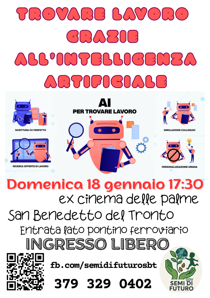 SAN BENEDETTO DEL TRONTO – Domenica 18 gennaio 2025, alle 17:30, presso l’ex Cinema delle Palme di San Benedetto del Tronto (ingresso lato pontino ferroviario), si terrà un incontro informativo dedicato all’utilizzo dell’intelligenza artificiale nella ricerca del lavoro.