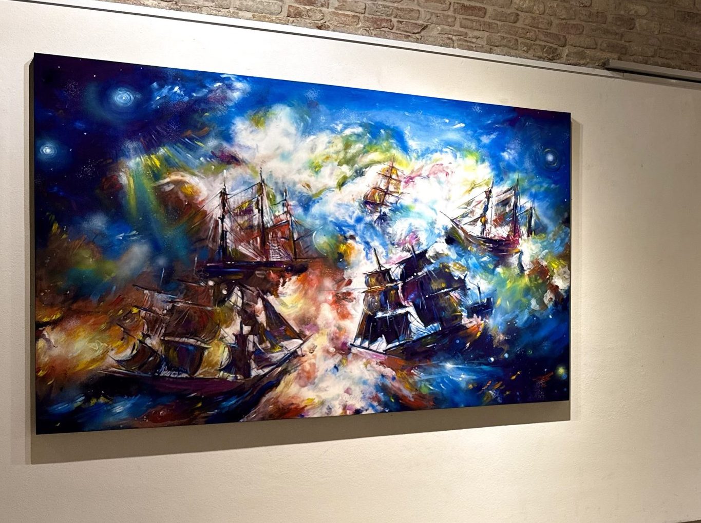 Tali opere, dall’evidente carica espressiva, lo hanno condotto in una dimensione ulteriore, in cui la perdita si è trasfigurata in viva riconoscenza e la memoria in una fortezza interiore, dove le stelle e le costellazioni che abitano le tele non appaiono come elementi cosmici quanto mappe dell’invisibile, segni di un ordine che eccede l’umano e che tuttavia lo accoglie. Fin dall’antichità, il cielo stellato è stato il luogo in cui l’uomo ha proiettato domande ultime: il destino, l’eternità, la giustizia, il senso. Da Platone fino a Kant, lo sguardo rivolto al firmamento è sempre stato un esercizio filosofico e spirituale, in Stars and Tears quel cielo sembra rispondere con immagini cariche di fiducia e contemplazione, come se l’artista vi cercasse — e trovasse — una forma di dialogo. Accanto alle stelle compaiono figure enigmatiche: tigri senza pupille, come se lo sguardo non appartenesse più al mondo sensibile ma a una dimensione altra; velieri che solcano l’alto mare, archetipi del viaggio dell’anima; cori angelici che evocano una presenza ordinatrice, una musica cosmica che tiene insieme ciò che appare frammentato. Ogni elemento è una metafora del passaggio tra due dimensioni: quella fisica, concreta e quella immateriale, spirituale. Non c’è opposizione tra le due, ma continuità, come nella tradizione teologica — da Agostino a Tommaso d’Aquino — il visibile non è negato, bensì assunto come segno di ciò che lo trascende.