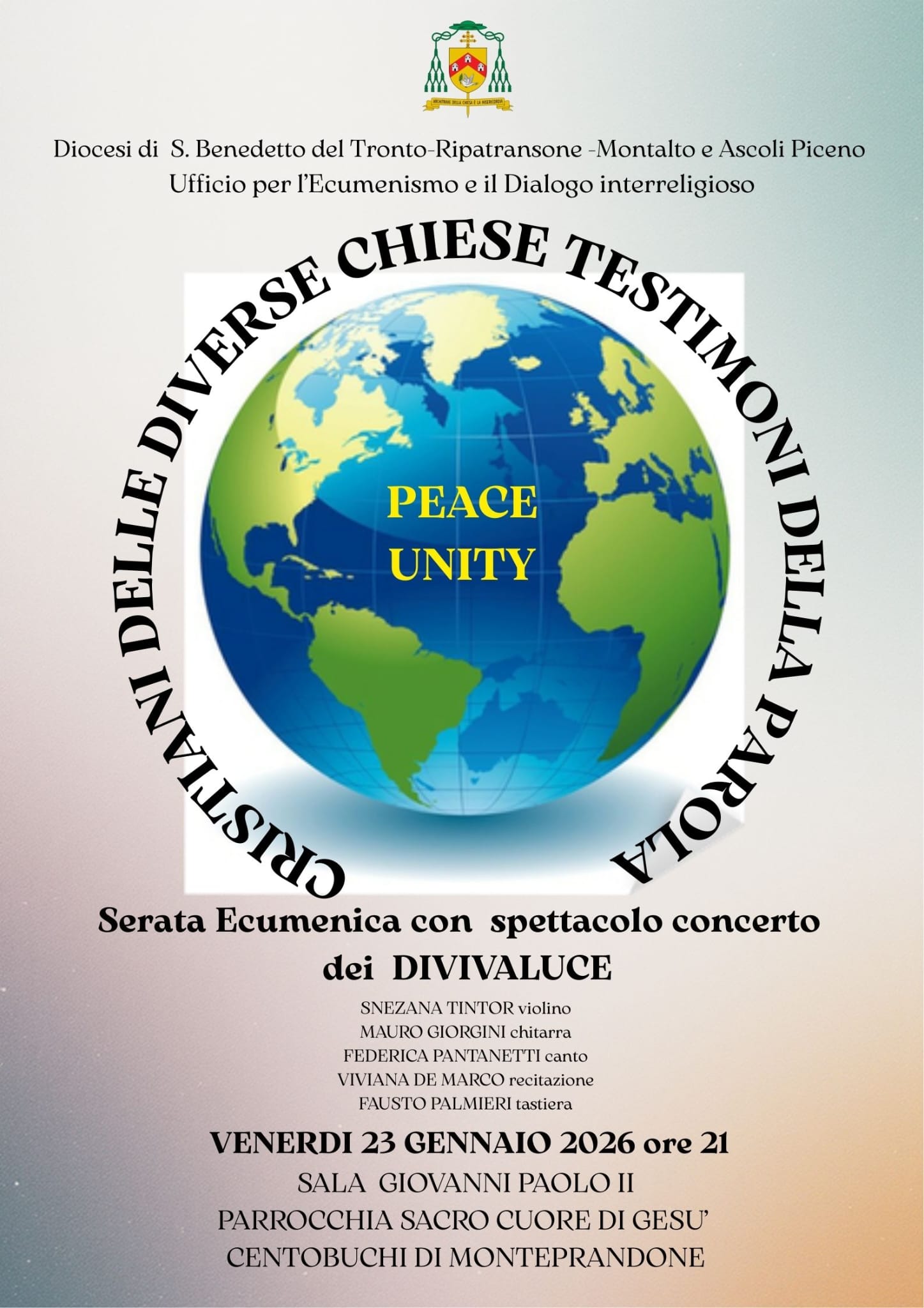 Per l’occasione, si terrà il concerto dei “DiVivaLuce“, che registrerà la partecipazione di Snezana Tintor al violino, Mauro Giorgini alla chitarra, Fausto Palmieri alla tastiera, Federica Pantanetti, alla quale sarà affidato il canto, e Viviana De Marco, incaricata regionale per l’Ecumenismo, a cui sarà affidata la recitazione.