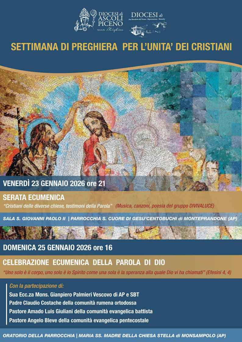 Domenica 25 Gennaio, invece, alle ore 16:00, presso l’oratorio della parrocchia Maria Santissima Madre della Chiesa, in Stella di Monsampolo, ci sarà la celebrazione ecumenica della Parola di Dio.