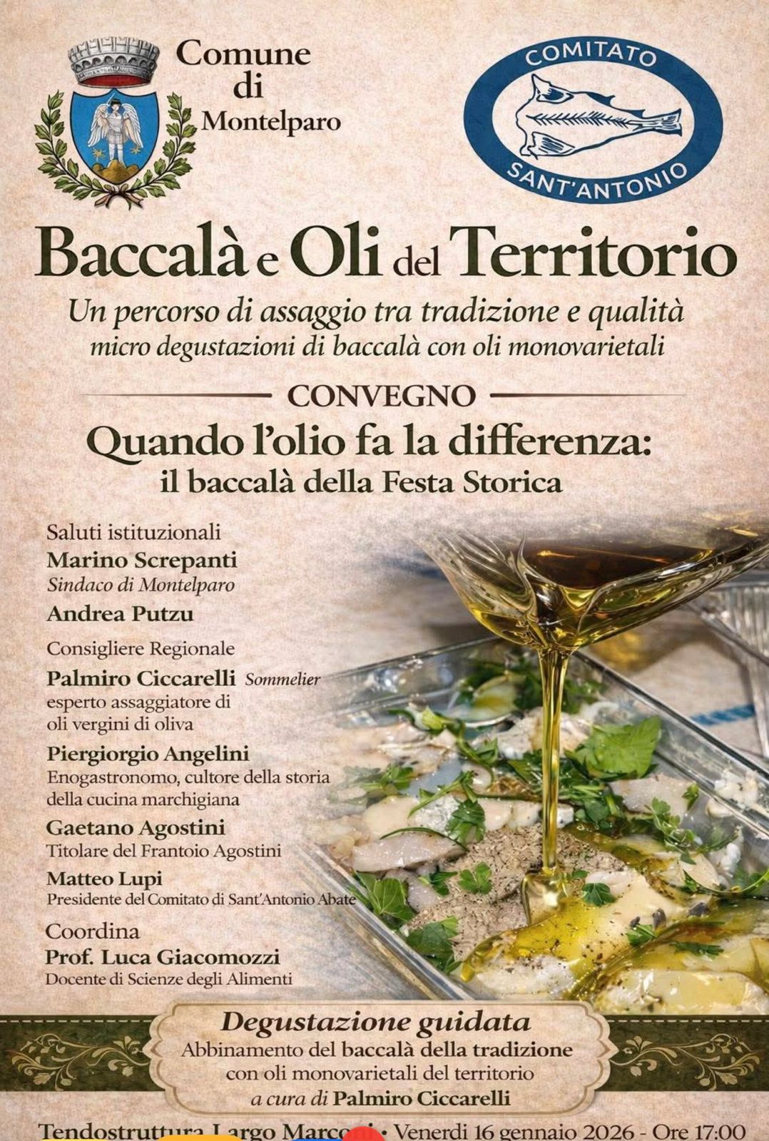 Nella giornata di venerdì 17 gennaio si è tenuto, sotto una tensostruttura appositamente allestita, un partecipato convegno dedicato al valore storico e centenario della Festa del Baccalà di Sant’Antonio Abate, incentrato sul tema “Baccalà e oli del territorio: quando l’olio fa la differenza”. Dopo i saluti istituzionali del sindaco Marino Screpanti, sono intervenuti i relatori Andrea Putzu (consigliere regionale), Palmiro Ciccarelli (sommelier ed esperto di oli vergini d’oliva), Piergiorgio Angelini (enogastronomo e cultore della storia marchigiana), Gaetano Agostini (produttore di olio d’oliva), Matteo Lupi (presidente del Comitato di Sant’Antonio Abate) e Luca Giacomozzi (docente di Scienze degli Alimenti).