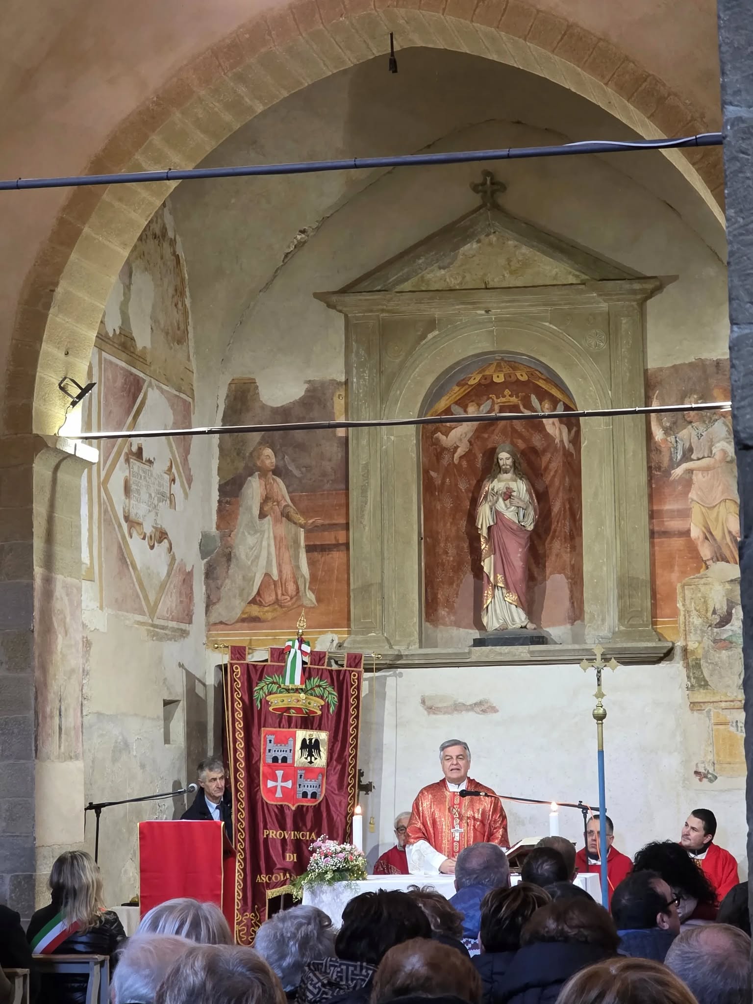 Momento centrale della celebrazione è stata la Santa Messa, animata dal coro parrocchiale, alla quale hanno preso parte anche i figuranti del Castello di Montemonaco e il Comitato San Sebastiano. Presenti numerose figure istituzionali: il Colonnello Sampaolesi, il Presidente del BIM Tronto Luigi Contisciani, la dirigente scolastica Alessia Cicconi e i sindaci dell’Unione Montana dei Sibillini Domenico Ciaffaroni, Fabrizio Vergari, Marino Screpanti, Cesare Milani e Domenico Sacconi. Hanno inoltre partecipato l’Arma dei Carabinieri e il Radio Club Piceno.