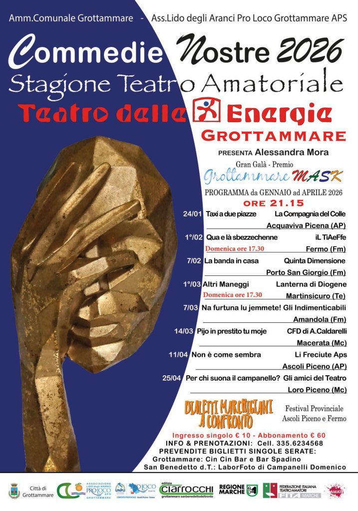 GROTTAMMARE – Dopo il grande successo di “Una Rotonda sul Mare”, la Pro Loco Lido degli Aranci è pronta a tuffarsi nella magia del Teatro Amatoriale Dialettale. Sabato 24 gennaio, alle ore 21.15, il Teatro delle Energie di Grottammare aprirà il sipario sulla ventiduesima edizione di “Commedie Nostre”, una rassegna che si preannuncia già memorabile grazie al record di abbonamenti venduti.