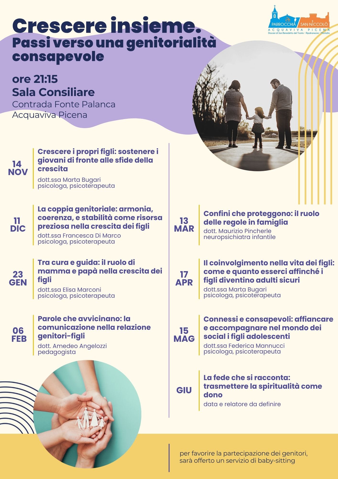 L’appuntamento, organizzato dalla parrocchia San Niccolò, registrerà la partecipazione della dott.ssa Elisa Marconi, psicologa e psicoterapeuta, la quale approfondirà il tema “Tra cura e guida: il ruolo di mamma e papà nella crescita dei figli”.