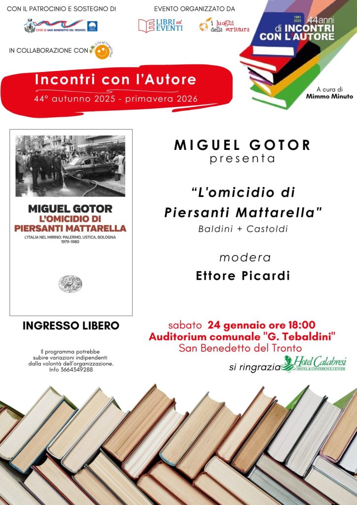 SAN BENEDETTO DEL TRONTO – Sabato 24 gennaio, alle ore 18, l’Auditorium comunale “G. Tebaldini” di San Benedetto del Tronto ospita un nuovo appuntamento della rassegna Incontri con l’Autore, giunta alla 44ª edizione. Protagonista dell’incontro sarà Miguel Gotor, che presenterà il libro “L’omicidio di Piersanti Mattarella. L’Italia nel mirino: Palermo, Ustica, Bologna (1979-1980)”.