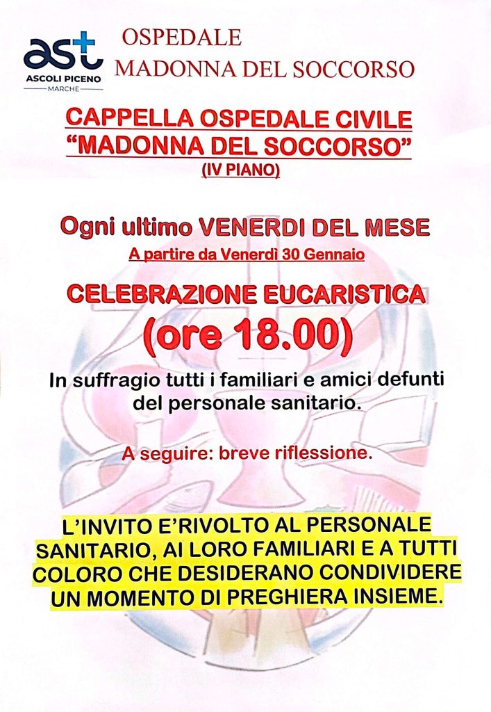 SAN BENEDETTO DEL TRONTO – Presso l’Ospedale “Madonna del Soccorso” di San Benedetto del Tronto, a partire da questo mese, ogni ultimo Venerdì del mese, ci sarà un momento di preghiera rivolto a tutti gli operatori sanitari, ai loro familiari e a chiunque voglia aggiungersi, quindi anche pazienti o visitatori.