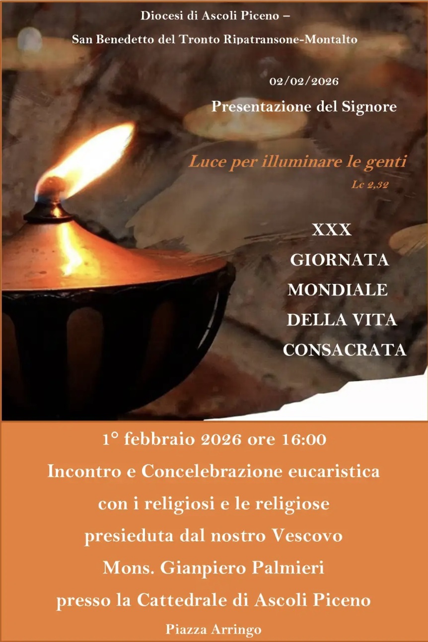 ASCOLI PICENO – Le Diocesi di Ascoli Piceno e di San Benedetto del Tronto, Ripatransone-Montalto si preparano a vivere la XXX Giornata Mondiale della Vita Consacrata, un appuntamento che richiama il valore della testimonianza dei religiosi e delle religiose nella vita della Chiesa e della società.