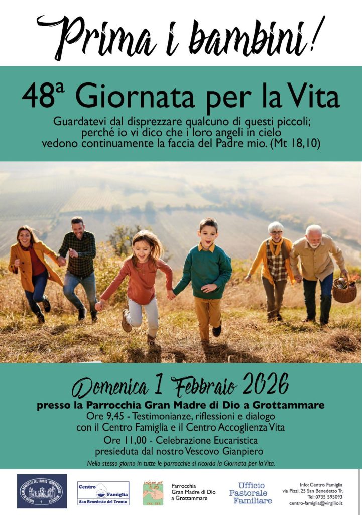 GROTTAMMARE – Si terranno a Grottammare le celebrazioni per la 48ª Giornata per la Vita, promossa dalla CEI (Conferenza Episcopale Italiana). Il tema scelto per l’anno 2026, “Prima i bambini!”, ha fatto ricadere la scelta sulla parrocchia Gran Madre di Dio, dedicata alla madre di tutte le madri, Maria, genitrice di Gesù e modello di ispirazione per tutte le mamme del mondo.