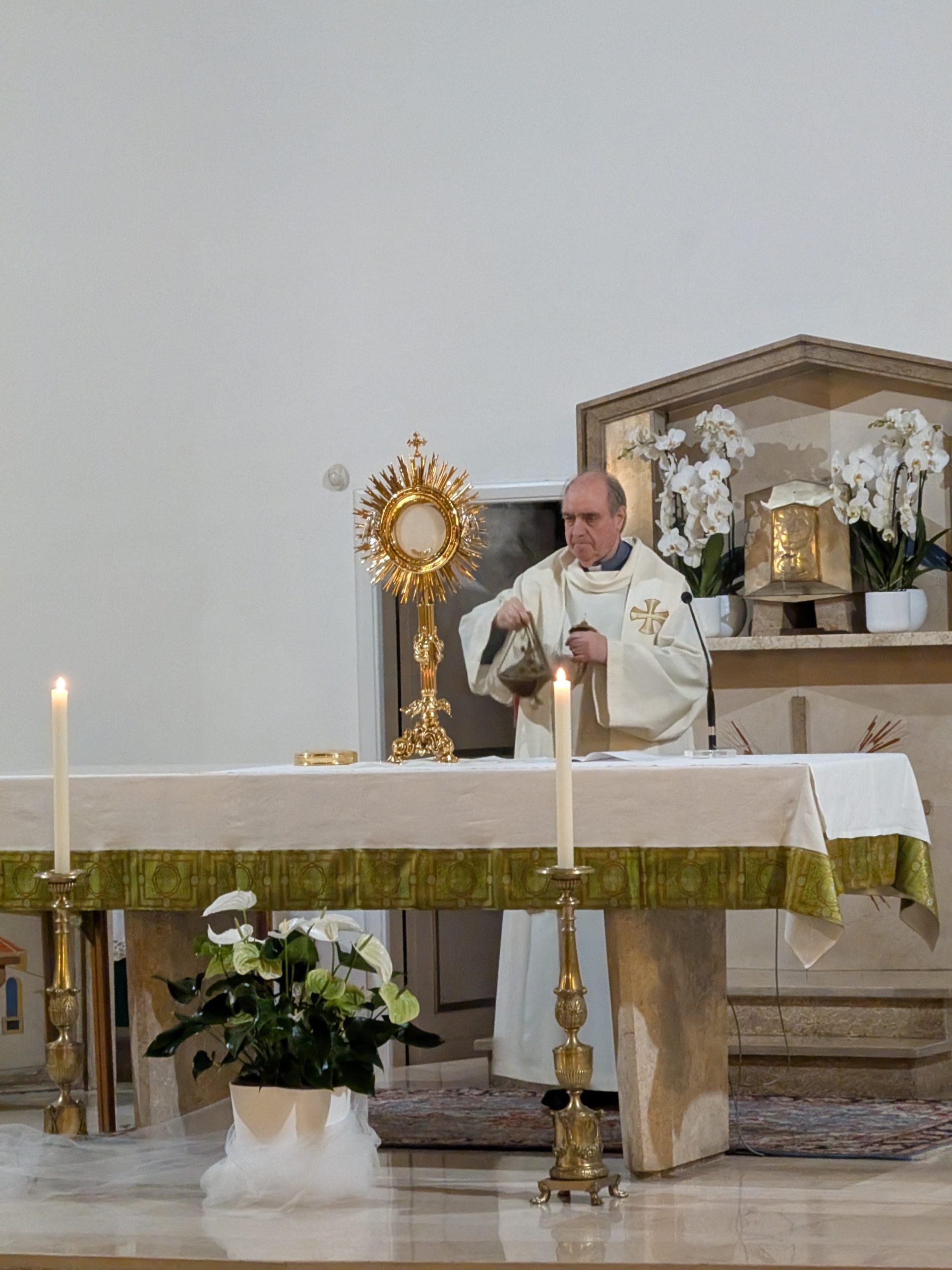 Dopo il canto “Ora è tempo di gioia” cantato dal coro “Voci della città”, prende la parola don Lino Arcangeli per la benedizione iniziale e per l’esposizione del Santissimo Sacramento.