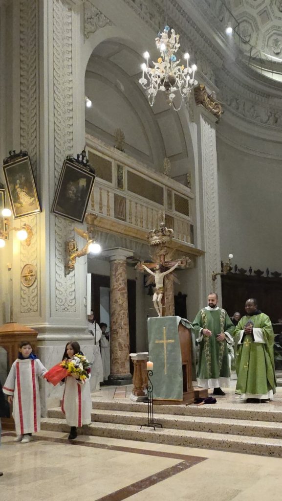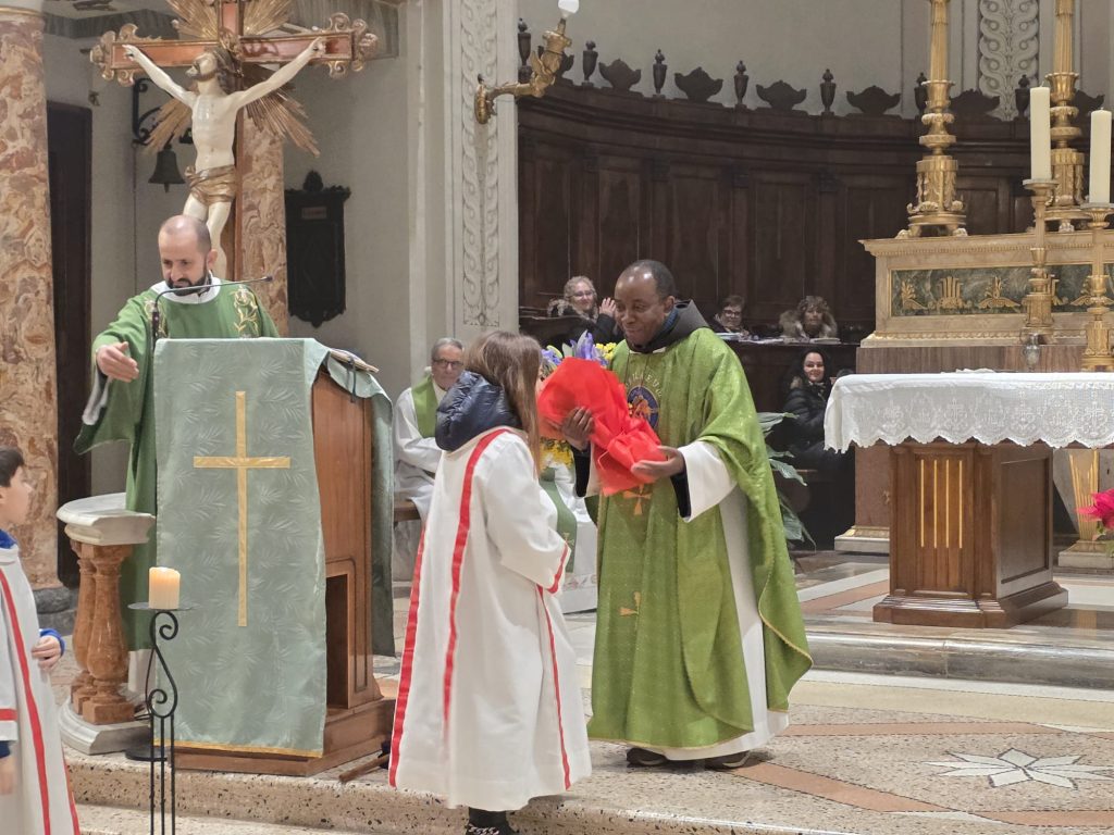 In segno di benvenuto, a nome della comunità cristiana, alcuni bambini hanno donato a padre François un mazzo di fiori, segno tangibile dell’accoglienza che i fedeli hanno riservato al nuovo parroco.