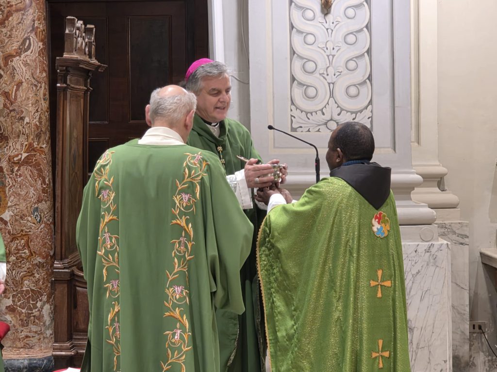 Ha poi preso la parola padre Simone Giampieri, provinciale della Provincia Picena San Giacomo della Marca, il quale ha detto: “Sono veramente lieto nel cuore per questo momento. Il vescovo Gianpiero ci ha dato la possibilità di tornare ancora a servire questa comunità parrocchiale. Per questo lo ringrazio, così come ringrazio padre François, per aver accettato, e quindi il suo ministro provinciale nel Congo, padre Georges Misange, con il quale abbiamo una collaborazione ormai sedimentata da anni. Nella nostra Provincia i numeri sono un po’ calati, quindi, come abbiamo fatto noi Europei in passato, ora tocca a loro venire ad evangelizzare qui da noi. Abbiamo frati provenienti dalla Nigeria, dal Congo, dall’Angola, dal Togo e dalla Polonia. Ringrazio poi don Vincent per il ministero svolto in questi anni ed infine il vicesindaco e la comunità , alla quale dico: ‘Accogliete padre Francois con gioia!’. Questo è un anno speciale, un anno profondamente francescano. E anche Monteprandone è una città intrinsecamente francescana, grazie alla testimonianza di San Giacomo della Marca. Essendo questa una chiesa officiata dai francescani, come concesso da papa Leone XIV, ogni giorno è possibile chiedere ed ottenere l’indulgenza plenaria“.