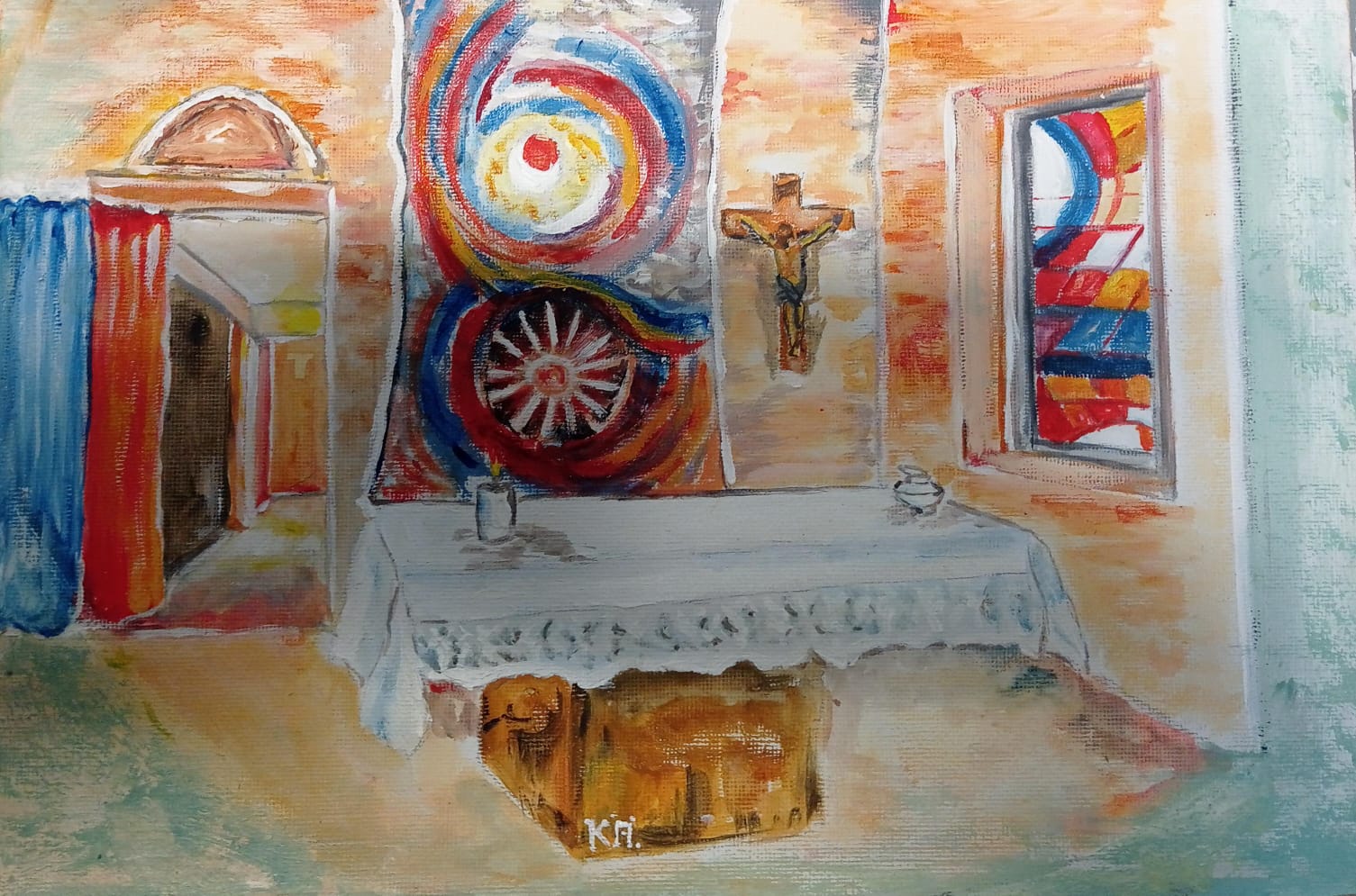Nel dipinto emergono con forza gli elementi più cari ai fedeli: l’altare, il crocifisso e le vetrate colorate, attraversate da una luce calda e accogliente. Un’immagine che custodisce l’anima di Villa Rosa e che accompagnerà il sacerdote come memoria tangibile del cammino condiviso.