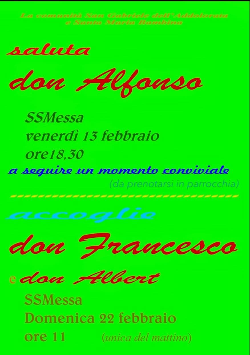 Venerdì 13 febbraio, ore 18:30 – Santa Messa di saluto presieduta da Don Alfonso. Al termine, seguirà un momento conviviale (previa prenotazione in parrocchia), occasione fraterna per esprimere affetto e gratitudine.