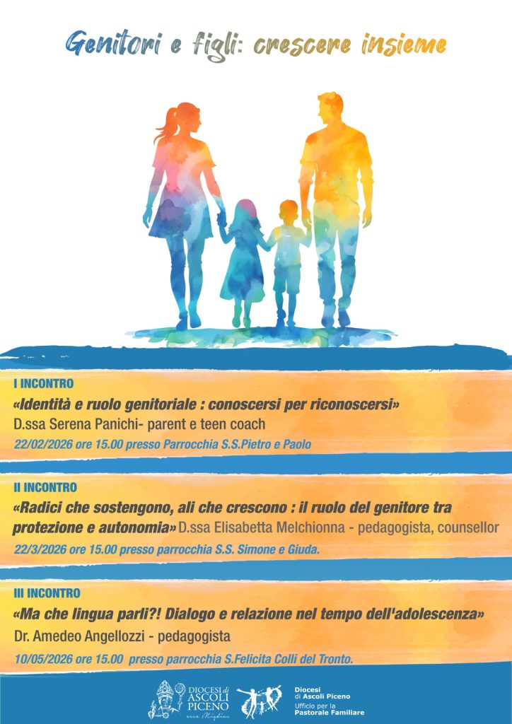 ASCOLI PICENO – Partirà Domenica 22 Febbraio 2026, ad Ascoli Piceno, il ciclo di incontri dal titolo “Genitori e figli: crescere insieme“, un percorso pensato per accompagnare i genitori delle Diocesi del Piceno, offrendo loro strumenti concreti, occasioni di riflessione e spazi di confronto e di dialogo.