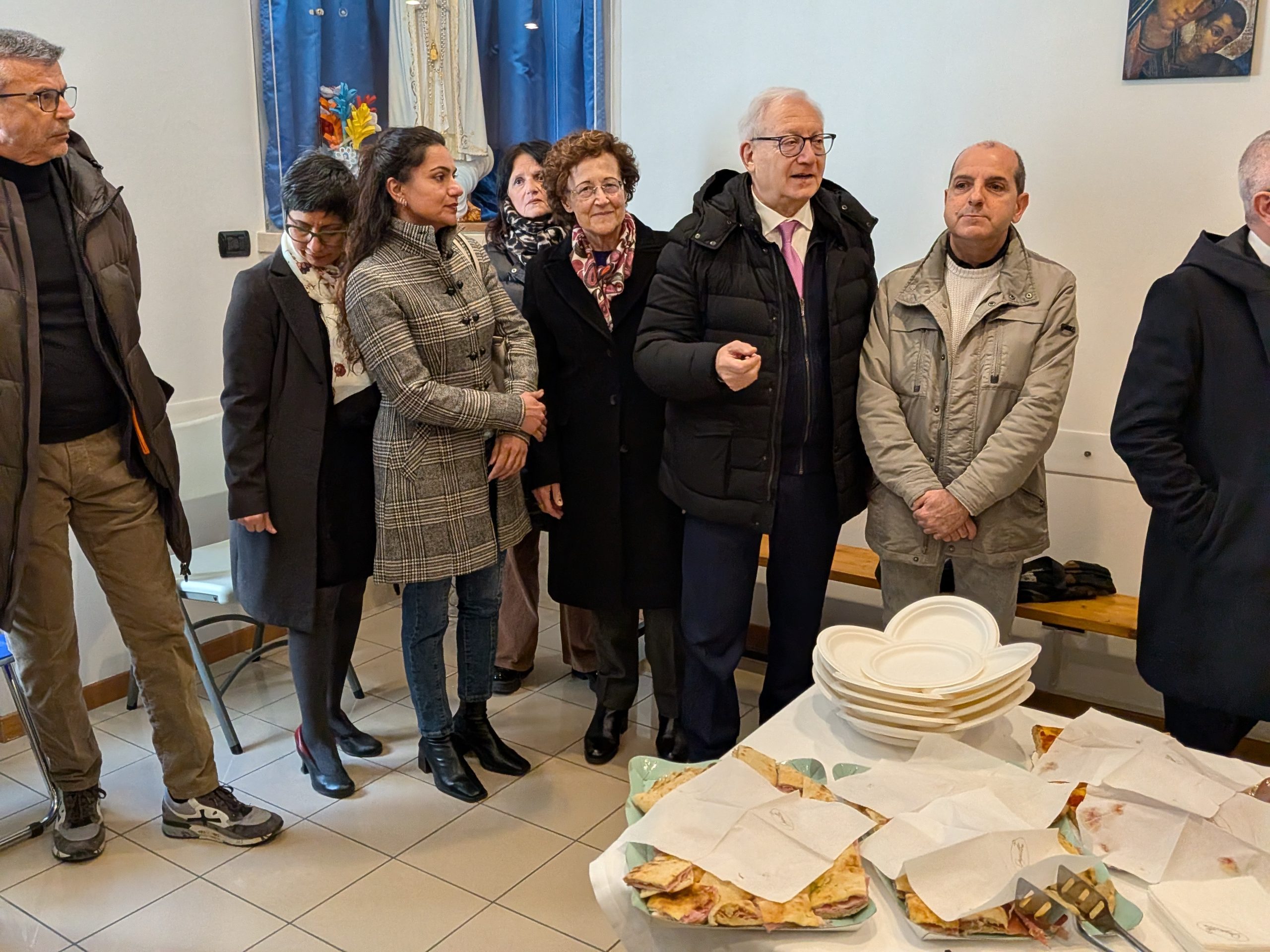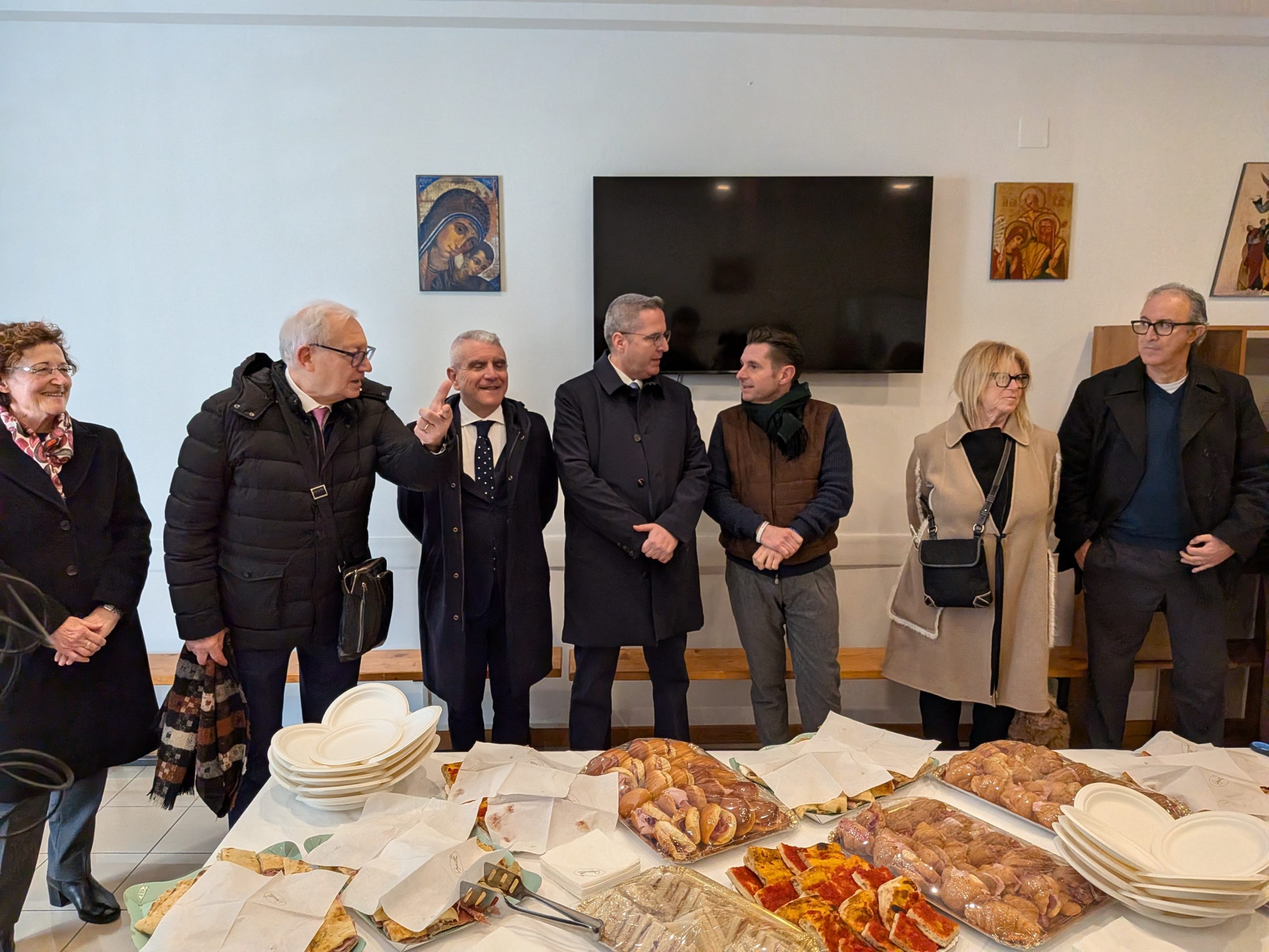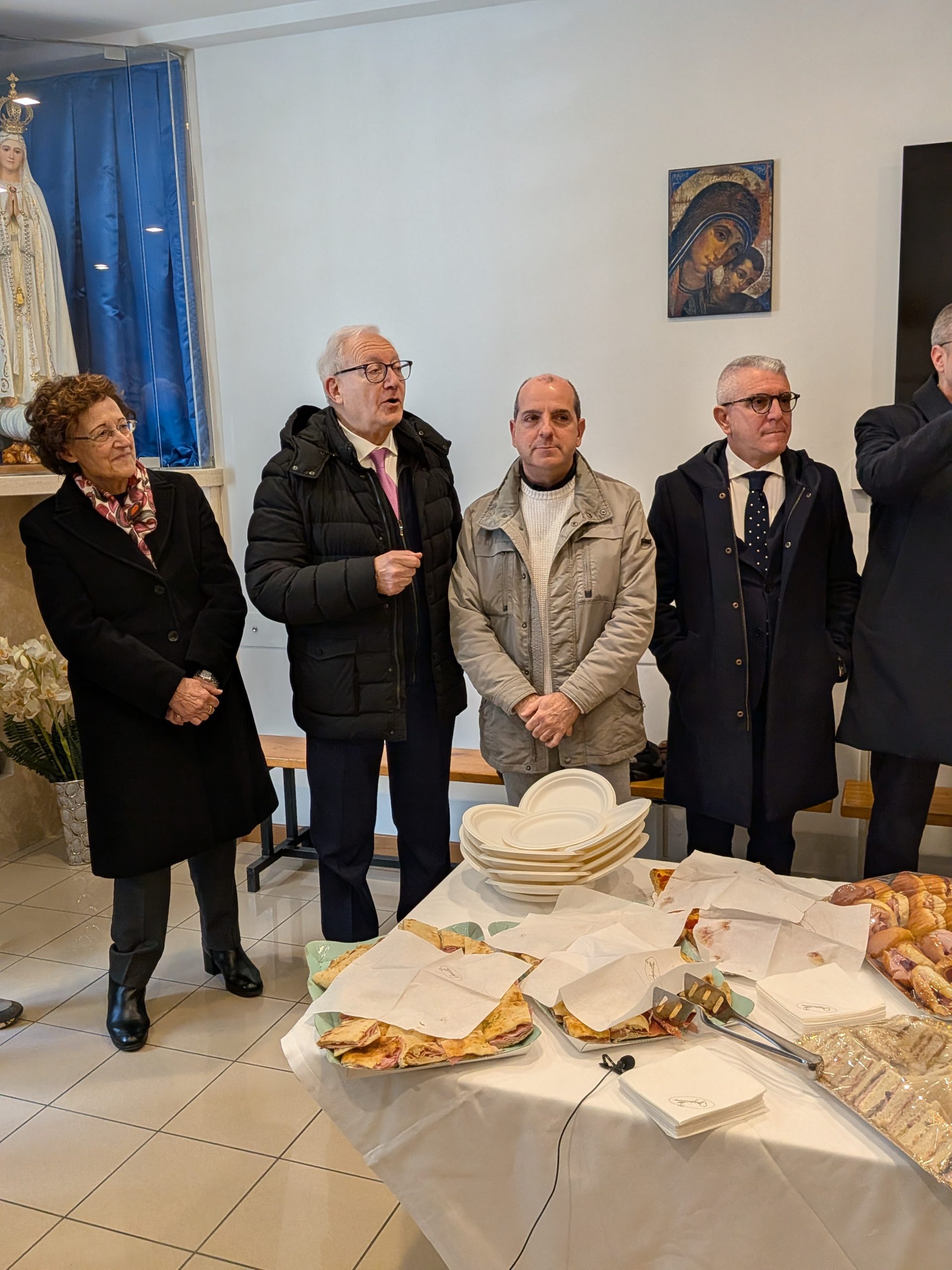 Tagliato il nastro, i presenti vengono fatti spostare in un altro locale parrocchiale, dove è stato preparato un invitante rinfresco, per ascoltare i discorsi di autorità ed istituzioni lì presenti.