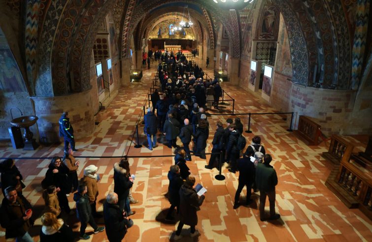 “È proprio vero che san Francesco vive! Migliaia di persone, in un clima di raccoglimento ma anche di gioia, hanno varcato le porte della basilica per venerare i resti mortali di san Francesco e sentirlo sussurrare nel loro cuore una parola di bene che sostiene e fa crescere. Un segno tangibile di questa gioia composta e festosa è il silenzio che avvolge la basilica: niente cellulari, niente selfie, solo tanta commozione e spiritualità. Un sentito grazie a tutti coloro che sono venuti, che amano Francesco e che collaborano con noi frati per rendere questa occasione un autentico momento di fraternità”. Così fra Giulio Cesareo, direttore dell’Ufficio comunicazione del Sacro Convento d’Assisi, al termine della prima giornata dell’ostensione pubblica delle spoglie mortali di san Francesco che si è aperta ieri nella chiesa inferiore della basilica di San Francesco in Assisi. Fin dalle prime, i pellegrini si sono messi in coda per la venerazione delle reliquie. L’accesso alla chiesa inferiore ha registrato una media di circa 1.500 persone ogni ora, consentendo a un numero significativo di pellegrini di raccogliersi in preghiera davanti alle spoglie del Santo. A tutti i pellegrini è stato consegnato un libretto pensato per accompagnare il percorso di venerazione. I dati – spiegano dal Sacro Convento di San Francesco – sono quelli di un grande “Giubileo francescano”: sold out tutti gli slot orari della prima giornata, confermando le previsioni, per un totale di circa 18.000 persone entrate nella chiesa inferiore della Basilica per rendere omaggio al Santo di Assisi.