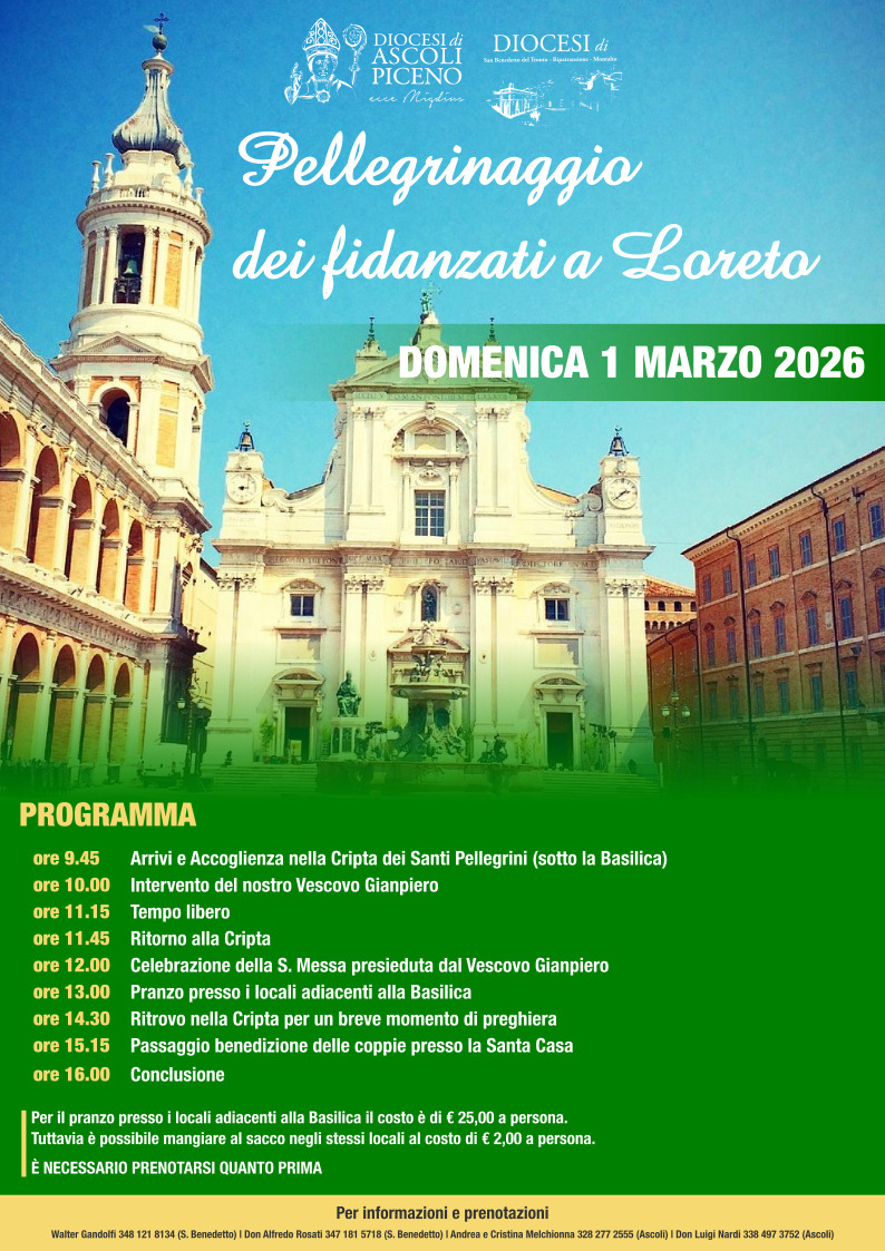 DIOCESI – Le equipe di Pastorale della Famiglia della Diocesi di Ascoli Piceno e della Diocesi di San Benedetto del Tronto–Ripatransone–Montalto rinnovano l’invito ai giovani fidanzati per il tradizionale pellegrinaggio annuale a Loreto, in programma domenica 1 marzo. Un appuntamento ormai consolidato che coinvolge coppie impegnate nel cammino di preparazione al matrimonio, accompagnate da parroci e collaboratori parrocchiali.