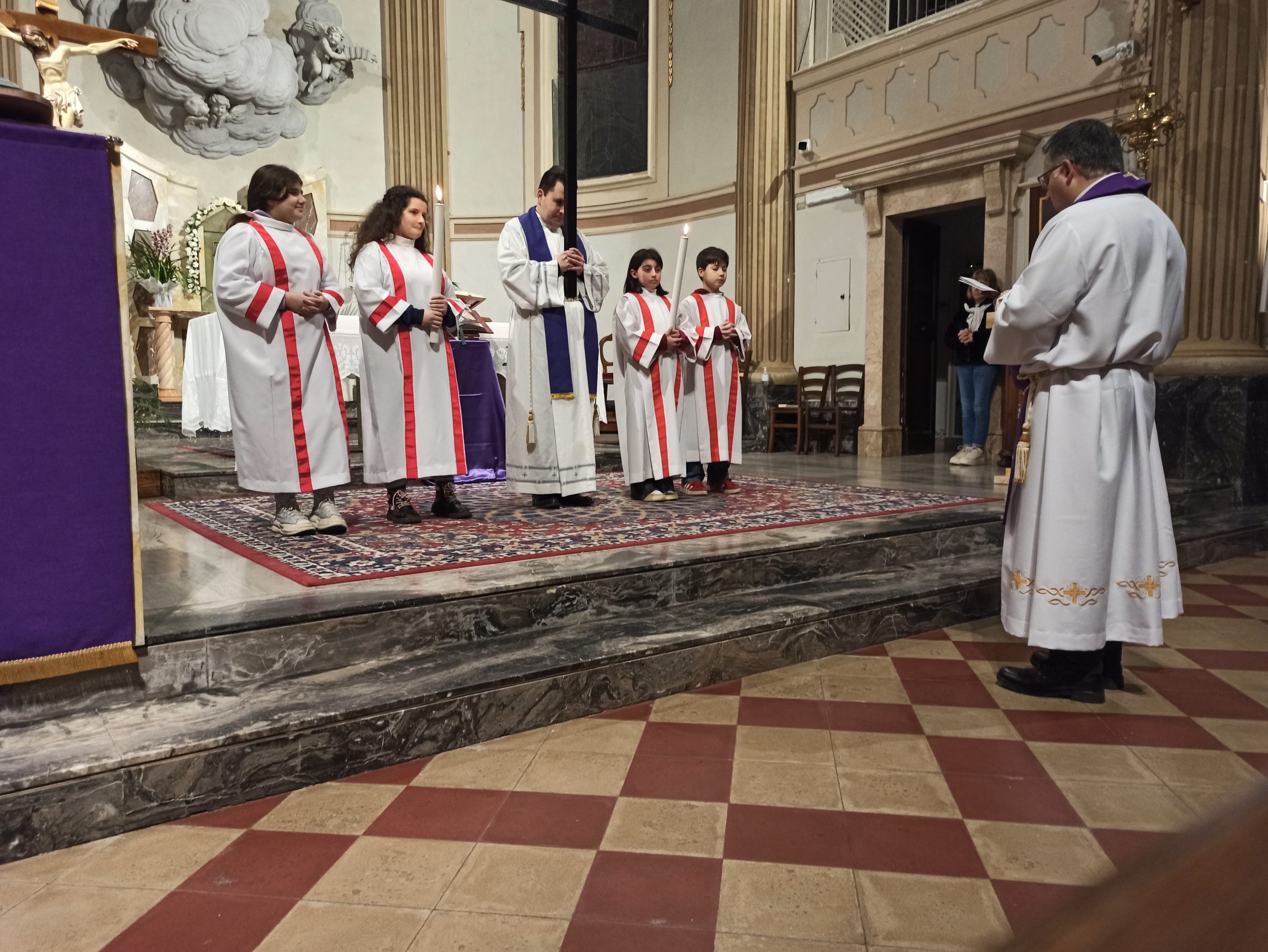 A rendere solenne la processione, i chierichetti accompagnano il sacerdote e la croce con ceri accesi, creando un’atmosfera di raccoglimento e devozione.