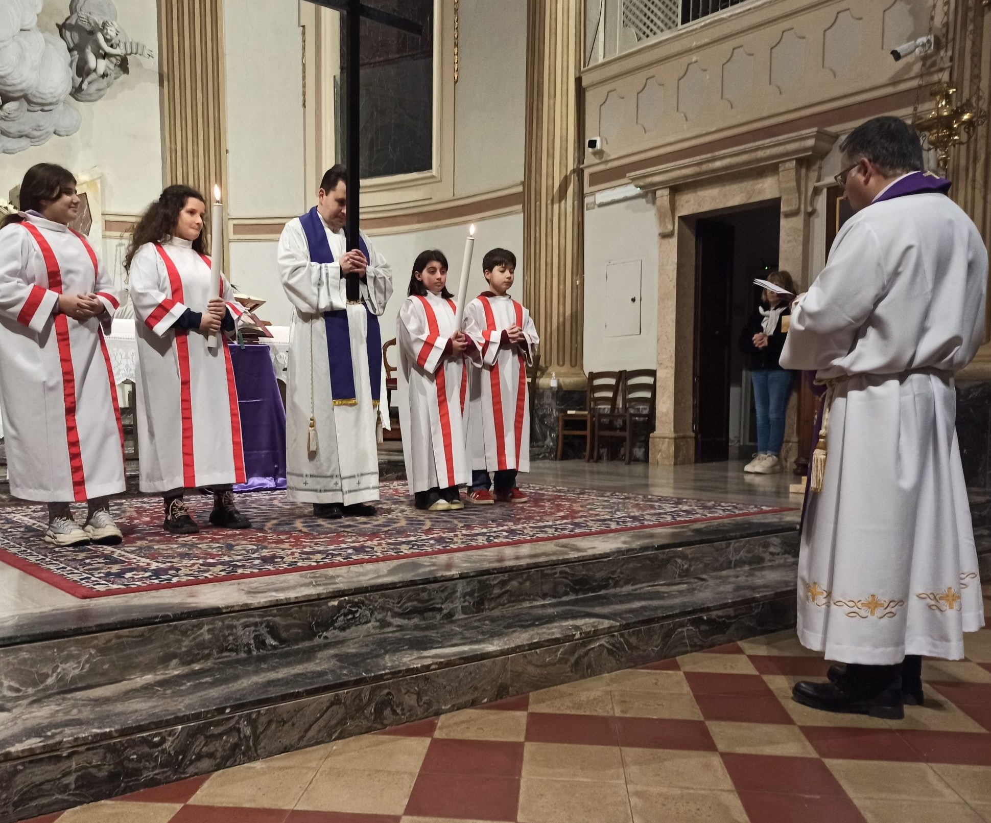 A rendere solenne la processione, i chierichetti accompagnano il sacerdote e la croce con ceri accesi, creando un’atmosfera di raccoglimento e devozione.