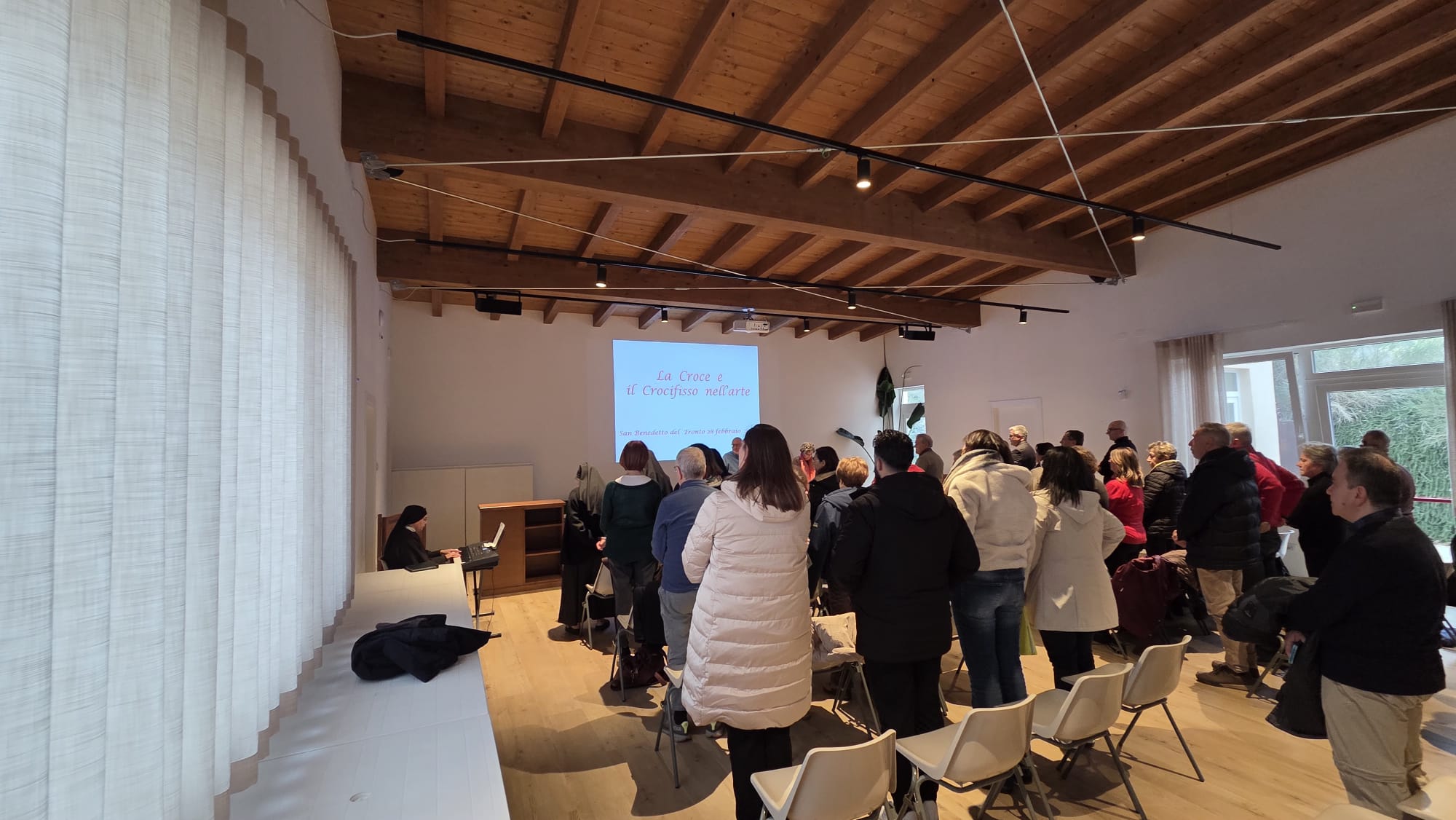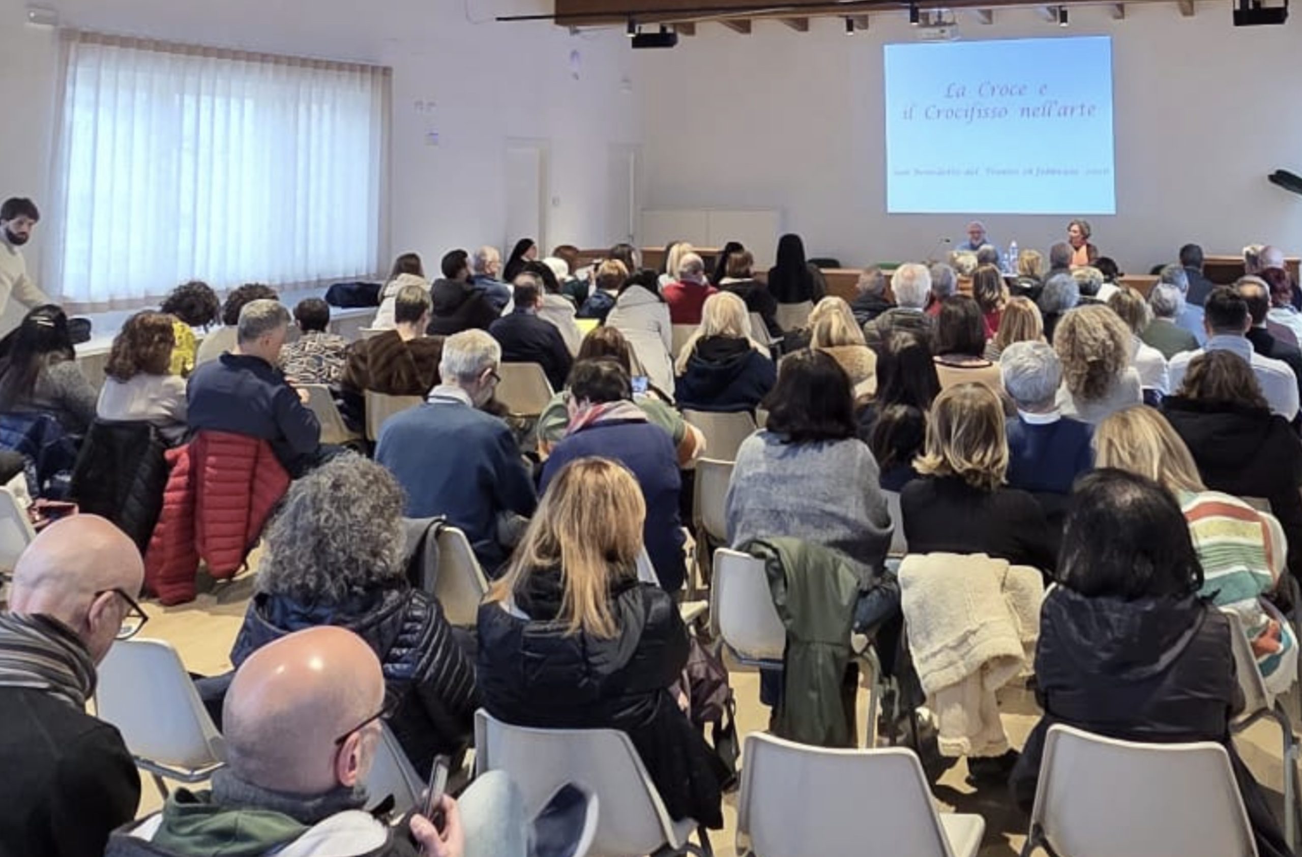 DIOCESI – Un pomeriggio di intensa partecipazione e riflessione ha segnato l’incontro promosso dal Servizio Apostolato Biblico diocesano sul tema della Croce e del crocifisso nell’arte cristiana. Numerosi i presenti nel salone del Monastero Santa Speranza delle Sorelle Clarisse di San Benedetto del Tronto, segno di un interesse vivo per un argomento che attraversa la fede, la storia e la cultura.