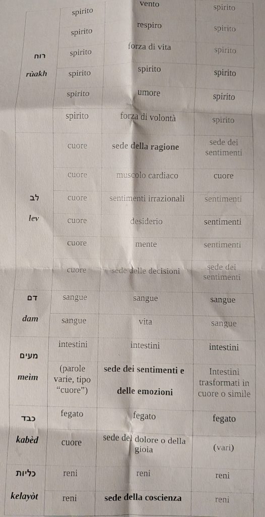 Conclusa questa prima parte, il vescovo Palmieri fa girare delle fotocopie contenti alcuni organi del corpo umano ed il loro significato. «Questa scheda – afferma il vescovo – ci è utile perché abbiamo il significato di questi organi in italiano, nella Bibbia e nella tradizione occidentale, quest’ultima, tuttavia, non è fedele al pensiero biblico, perché impregnata dell’ideologia platonica che vede il corpo come carcere dell’anima, quindi c’è una netta distinzione tra materiale ed immateriale.