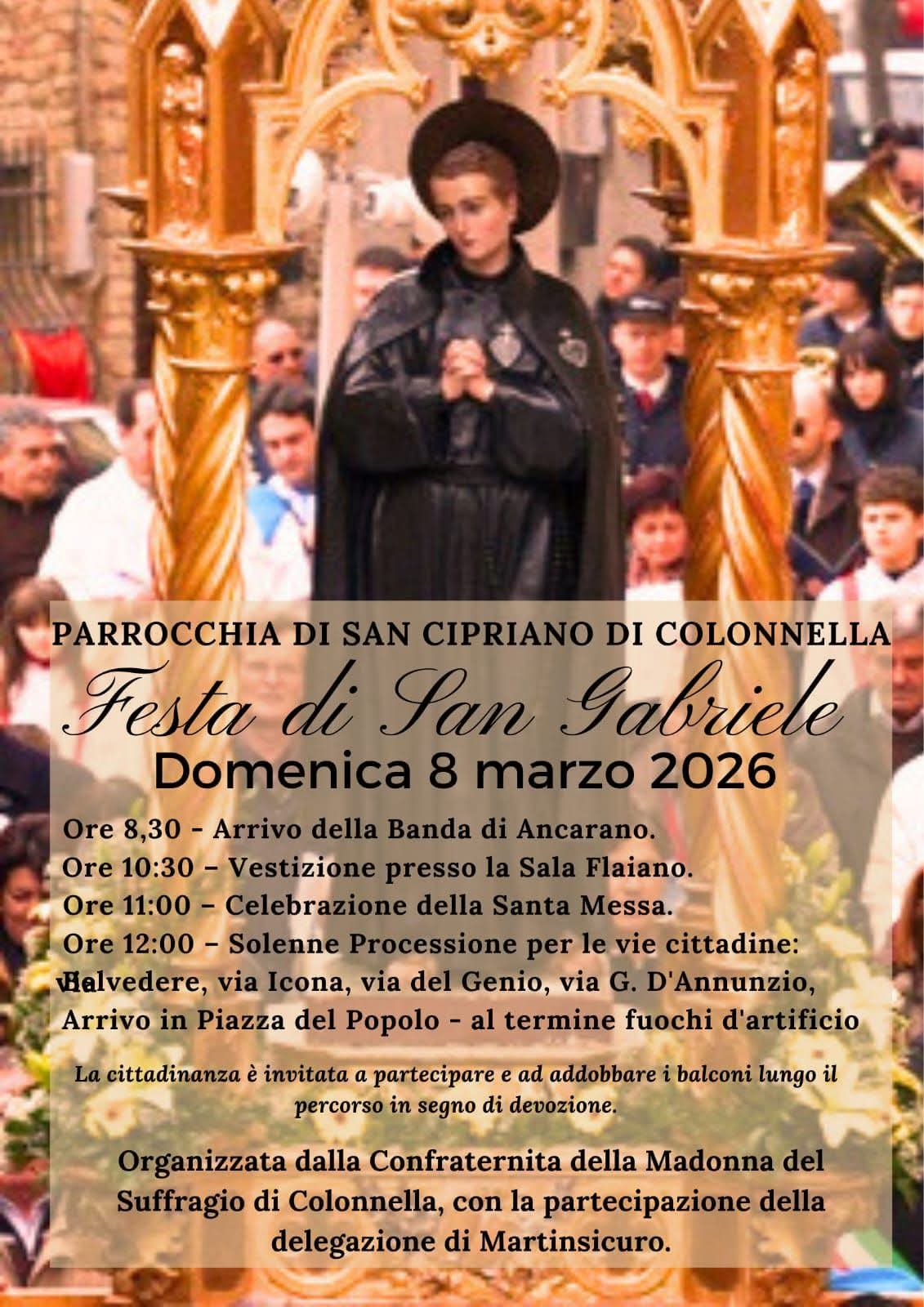Oggi San Gabriele è compatrono d’Abruzzo e patrono della gioventù cattolica, molto amato dai giovani, soprattutto nelle cittadine di Colonnella e Martinsicuro, che un tempo costituivano un unico Comune. Non a caso, a rendere ancora più belli i festeggiamenti sarà la partecipazione di una delegazione della Confraternita San Gabriele dell’Addolorata di Martinsicuro.