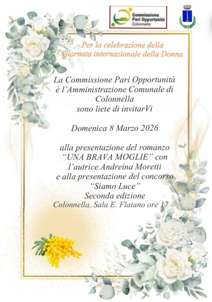 Domenica 8 Marzo ricorre anche la Giornata Internazionale della Donna. Dopo i festeggiamenti in onore di San Gabriele, quindi, nel pomeriggio si svolgerà una iniziativa per celebrare la ricorrenza. Curato dalla Commissione Pari Opportunità e dall’Amministrazione Comunale di Colonnella, alle ore 17:00, presso la Sala Flaiano, si terrà un incontro durante il quale verrà presentato il romanzo “Una brava moglie” di Andreina Moretti.