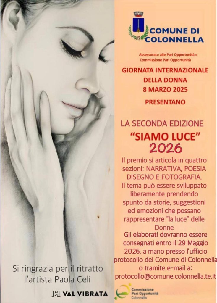 L’appuntamento, che registrerà la partecipazione dell’autrice, sarà l’occasione anche per presentare la 2ª edizione del Concorso “Siamo luce”. Il Premio si articola in quattro sezioni: narrativa, poesia, disegno e fotografia. Il tema può essere sviluppato liberamente, prendendo spunto da storie, suggestioni ed emozioni che possano rappresentare la luce delle donne nel mondo. Gli elaborati dovranno essere consegnati entro il 29 Maggio 226 a mano, presso l’Ufficio Protocollo del Comune di Colonnella, oppure tramite e-mail all’indirizzo protocollo@comune.colonnella.it.