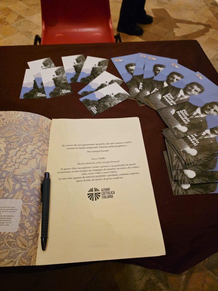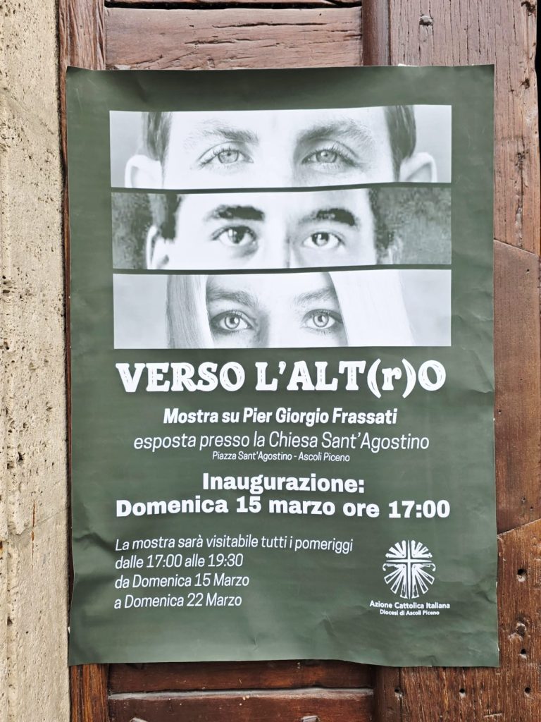 “‘Verso l’AltRo’ è una mostra itinerante dell’Azione Cattolica Italiana che sta viaggiando per le varie Diocesi d’Italia. L’abbiamo voluta anche qui ad Ascoli Piceno per far conoscere Pier Giorgio Frassati, non solo la sua figura di santo, ma anche quella di un uomo, anzi un ragazzo, che si è sporcato le mani in mezzo alla povertà, senza rinunciare alla sua vita di giovane. Di lui vogliamo sottolineare l’impegno umano, sociale e politico, per rendere il suo mondo Come ha detto il nostro vescovo Gianpiero, è grande l’eredità che ci ha lasciato come