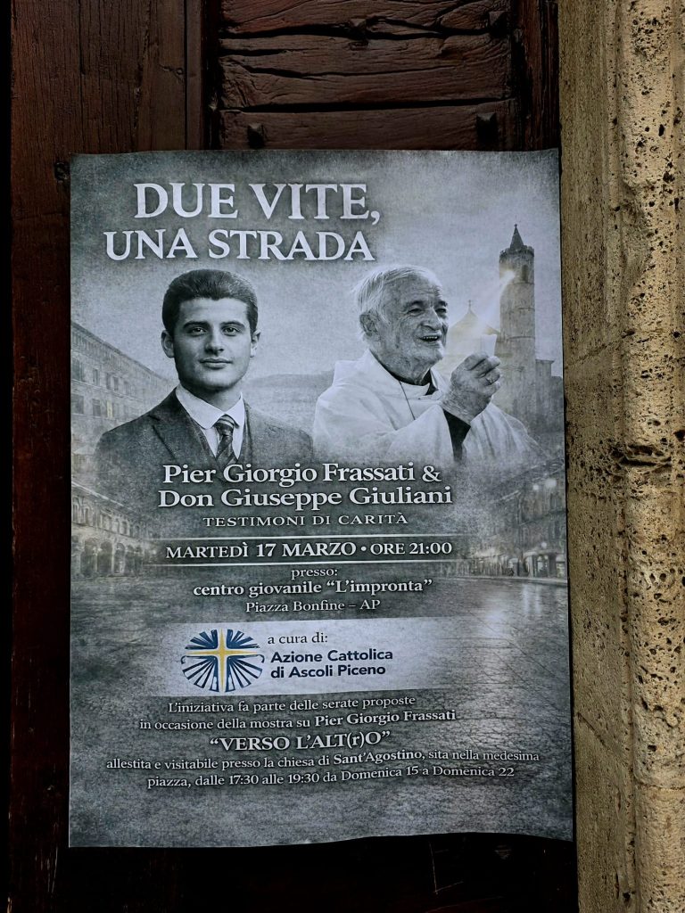 L’incontro metterà “in dialogo” la testimonianza del Santo Frassati con l’esperienza di carità del compianto don Giuseppe Giuliani, parroco della comunità di San Marcello ad Ascoli e storica voce, nonché già direttore, dell’emittente radiofonica locale Radio Ascoli. Don Giuseppe fu un appassionato sostenitore dell’Azione Cattolica e accompagnò con amore e pazienza i numerosi giovani della comunità ascolana.