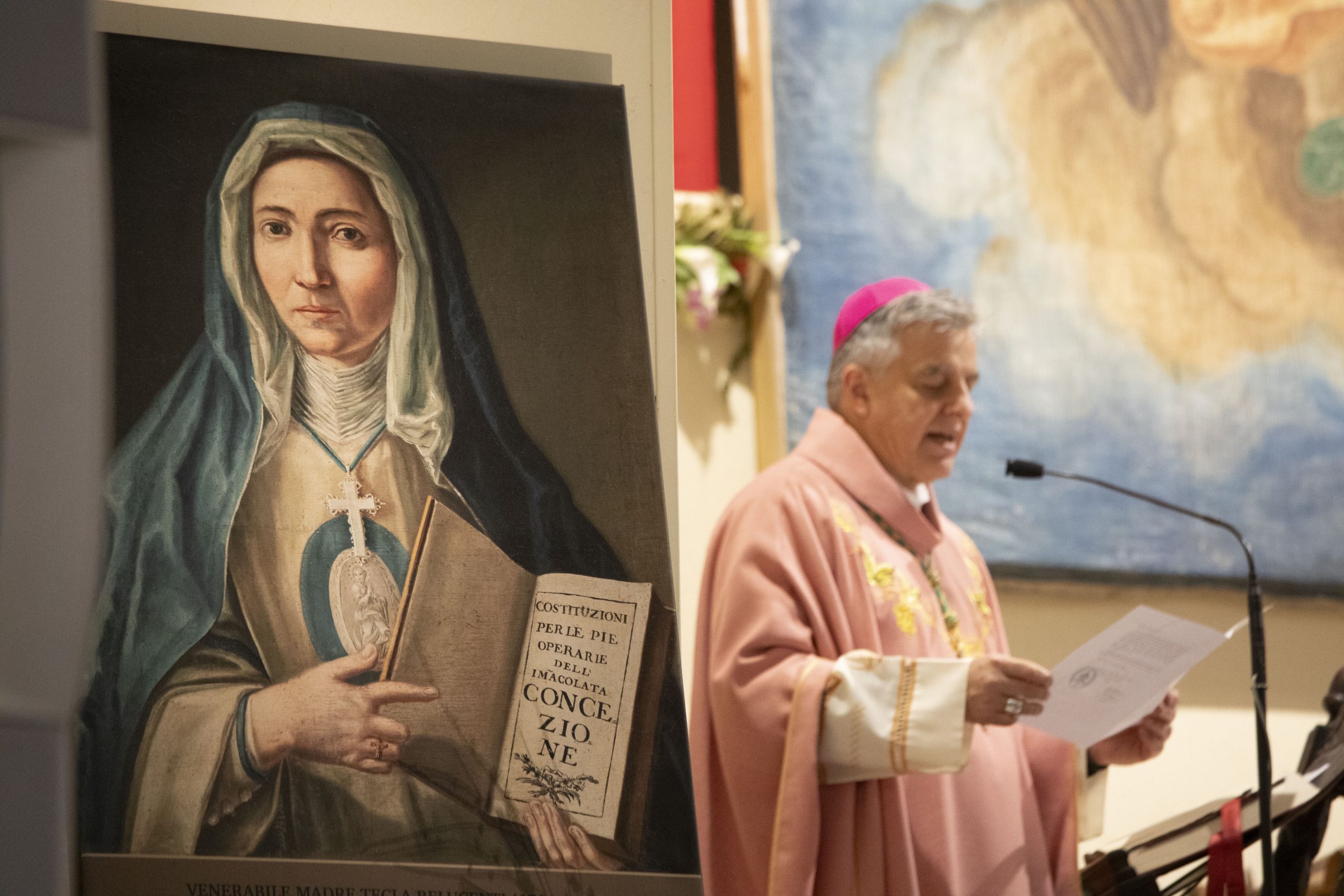 Prende la parola il vescovo Palmieri per la lettura del Decreto del Dicastero della Dottrina dei Santi in merito alle virtù eroiche della Venerabile Tecla Relucenti: «La vicenda della Serva di Dio, Maria Tecla Relucenti, è strettamente legata a quella del venerabile, Francesco Antonio Marcucci, con il quale collaborò per la formazione della Congregazione delle Suore Pie Operaie dell’Immacolata Concezione.