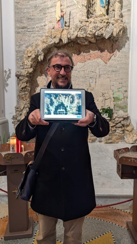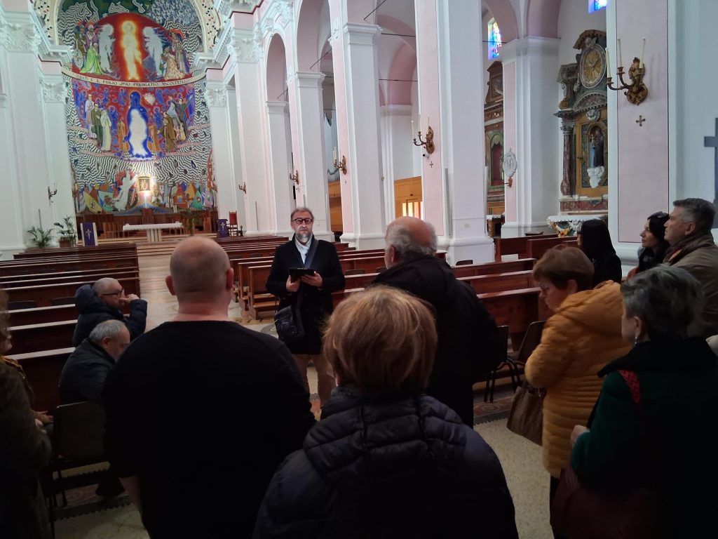 La visita alle cappelle e agli altari laterali si conclude davanti al monumento realizzato dall’artista offidano Aldo Sergiacomi che celebra don Francesco Sciocchetti e suo fratello Luigi. Abbiamo pertanto modo di parlare di queste due straordinarie figure. Don Francesco Sciocchetti era originario di Ripatransone e, prima di diventare parroco della Marina, fu parroco della Petrella di Ripatransone. Fu chiamato a dare una mano ai pescatori di San Benedetto che erano stati colpiti da una mareggiata che aveva portato via le loro barche, acuendo così la loro condizione di povertà, già tanto compromessa. Da allora l’aiuto alla povera gente fu il centro della sua azione pastorale e si prodigò in ogni modo per alleviare le sofferenze della popolazione. Nel 1912 varò il San Marco, primo motopeschereccio in Italia, che vediamo rappresentato a sinistra. Al centro troviamo proprio lui, don Francesco, in mezzo al gruppo dei ministranti ai quali aveva dato nome di “Luigini” in onore di San Luigi Gonzaga. Fra questi si distingue Giacchino Bruni (1882-1905) che diventerà sacerdote passionista col nome di Padre Giovanni dello Spirito Santo e che la chiesa onora come Venerabile. Alle spalle si trova la sua opera più importante, la Madonna della Marina, nelle forme che assunse al momento della sua realizzazione nel 1908. Sotto la Torre dei Gualtieri delle signore ricamano: anche questo è un’omaggio all’attività sociale promossa da don Francesco. Infatti egli presso i locali dell’Asilo Merlini, grazie a Suor Maddalena, mise su un laboratorio di sartoria in modo tale da aiutare quelle donne rimaste sole a causa della partenza dei mariti al fronte a causa della Prima Guerra Mondiale. Infine, sulla destra vediamo don Luigi Sciocchetti mentre realizza il dipinto che campeggia in alto: si tratta di una Madonna della Marina, non secondo le tradizionali sembianze, ma con i tratti di una donna del popolo. Sia a destra che a sinistra della Vergine si trovano delle barche. Il dipinto faceva bella mostra di sé nell’antica Cappellina della Madonna di Lourdes che si trovava dove oggi c’è la sacrestia.