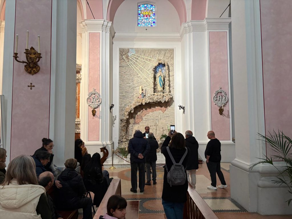 Spostiamoci ora nella Cappella della Madonna di Lourdes realizzata nel 1977 da Aldo Sergiacomi in sostituzione della precedente cappella, demolita per far spazio alla nuova sacrestia. L’opera d’arte è divisa in due. Nella parte superiore Santa Bernadette Soubirous è inginocchiata davanti alla Madonna che vide per 18 volte dall’11 febbraio al 16 luglio 1858. La testa della Madonna è coronata dalle parole «Io sono l’Immacolata Concezione», traduzione in italiano delle parole dialettali «Que soy era Immaculada Councepciou» con le quali la Vergine si rivelò il 25 marzo a Bernadette e che confermano il dogma della Immacolata Concezione, proclamato solo 4 anni prima da Pio IX. Questo è l’unico caso nella Storia della Chiesa in cui un dogma è stato confermato dal Cielo. Nella parte sottostante vediamo la Benedizione Eucaristica rivolta agli ammalati e la citazione dantesca «Se di speranza fontana vivace». Nella cappella è incastonato un frammento proveniente dalla grotta di Lourde. Ai piedi della cappella si trovano le tombe dei vescovi diocesani dove riposano i resti di Giuseppe Chiaretti e Gervasio Gestori.