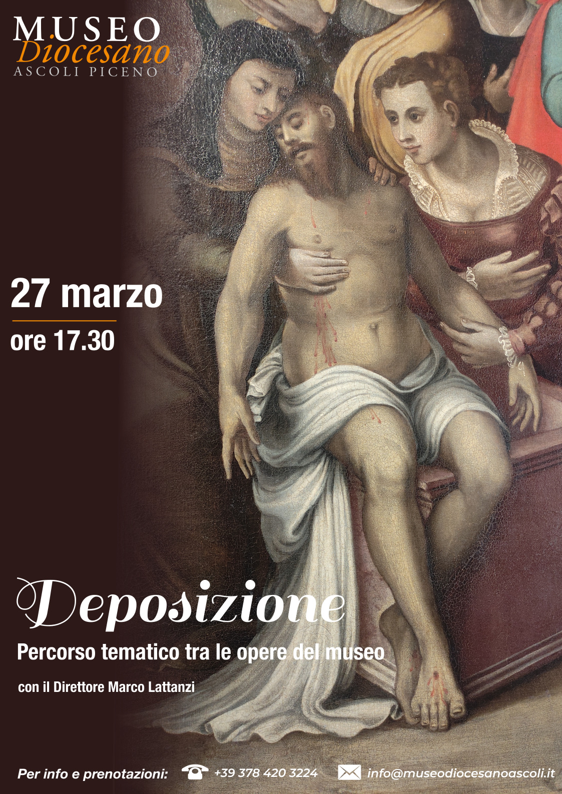 L’iniziativa propone una visita guidata esclusiva condotta dal Direttore del Museo, Marco Lattanzi, che accompagnerà i visitatori in un percorso suggestivo tra opere d’arte accomunate dalla rappresentazione della Deposizione e del Compianto sul Cristo.