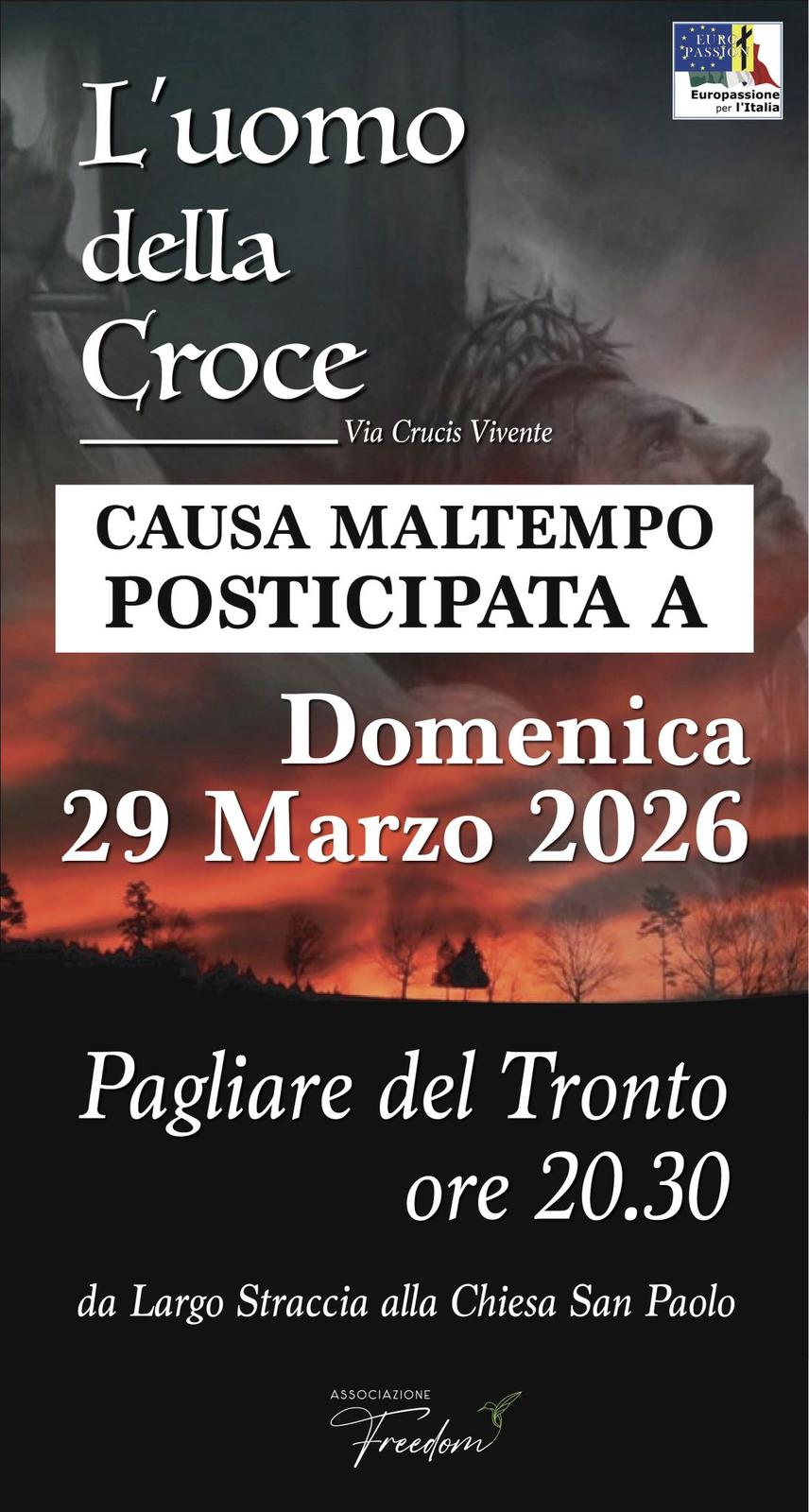 PAGLIARE DEL TRONTO – Domenica 29 marzo 2026 torna per le vie del paese “L’uomo della croce”, la rappresentazione vivente degli ultimi momenti della vita di Cristo, organizzata dall’Associazione Freedom.